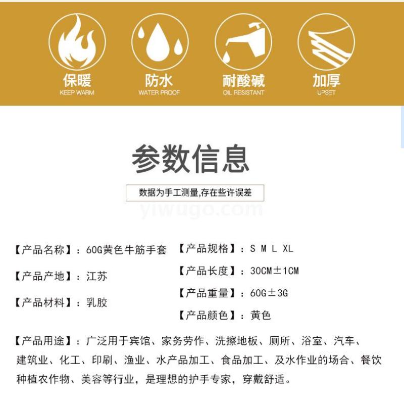 【产品用途】:广泛用于宾馆、家务劳作、洗擦地板、厕所、浴室、汽车、建筑业、化工、印刷、渔业、水产品加工、食品加工、及水作业的场合、餐饮、种植农作物、美容等行业,是理想的护手专家,穿戴舒适。