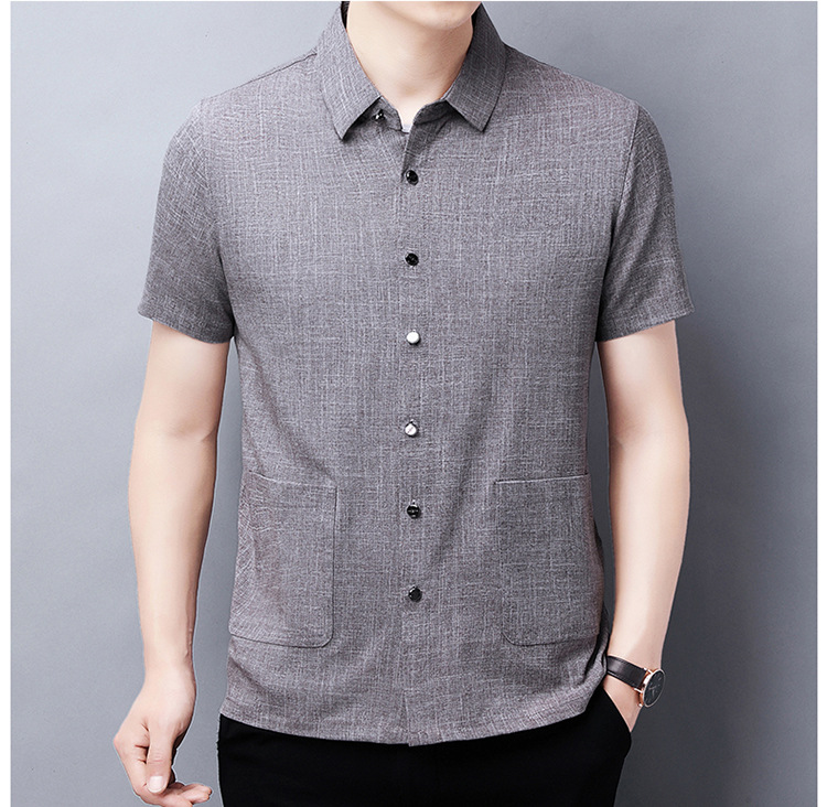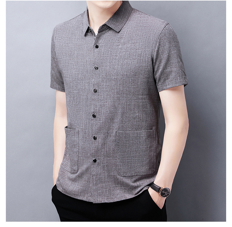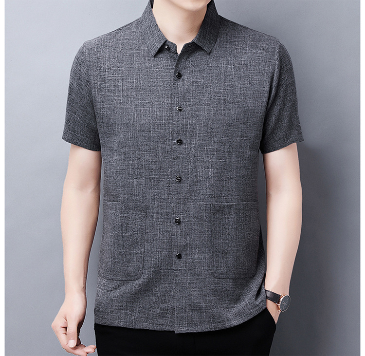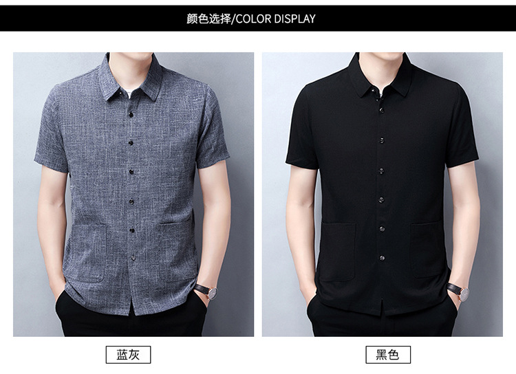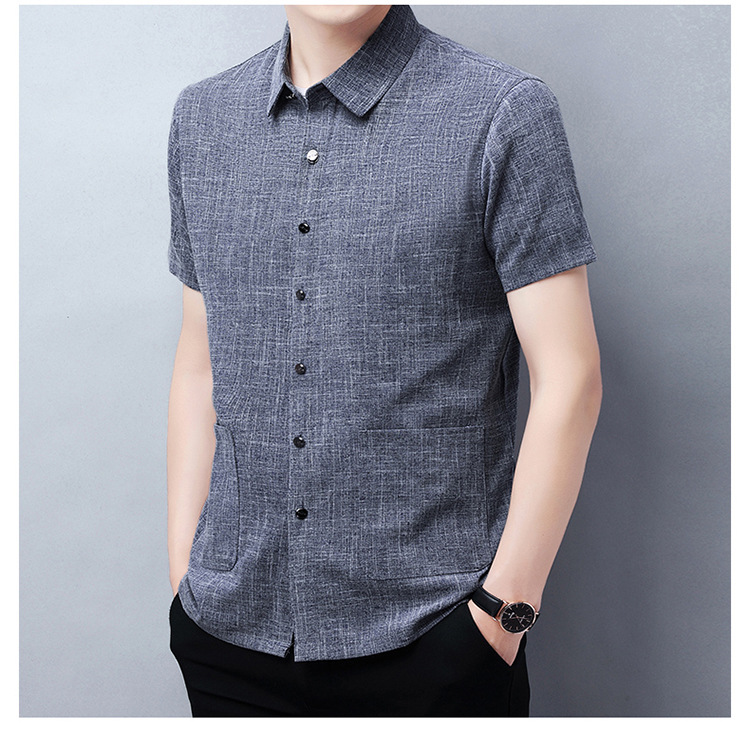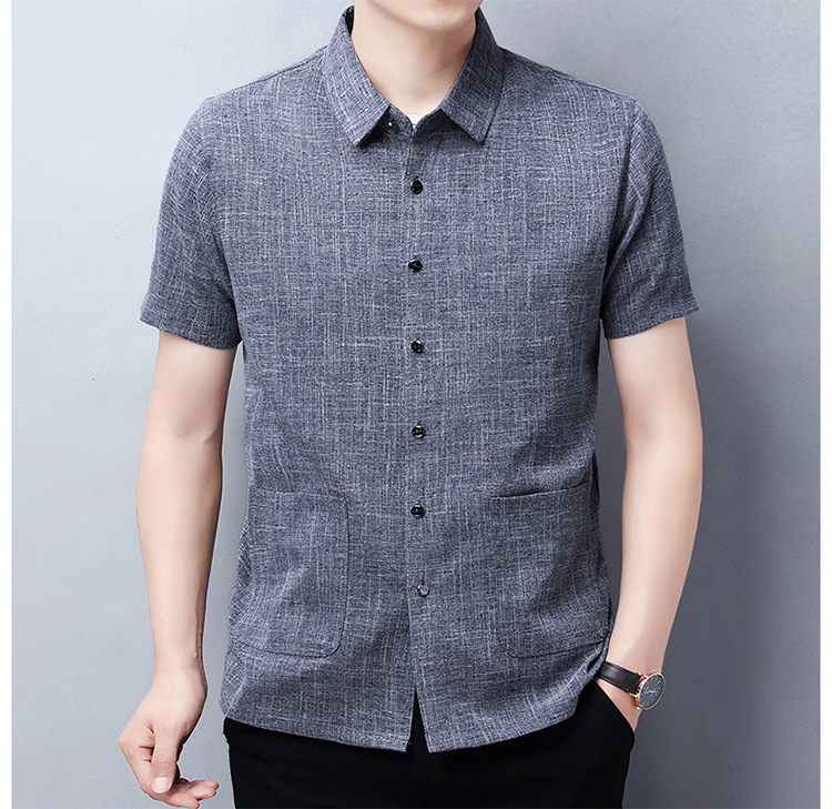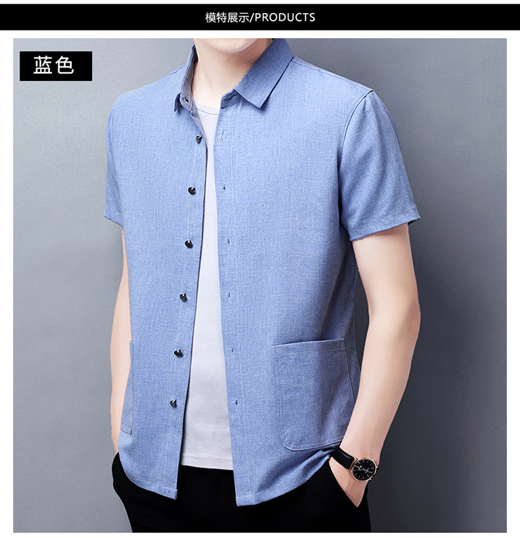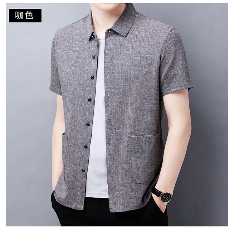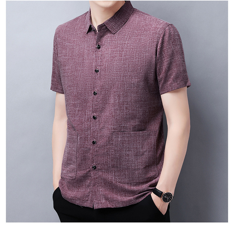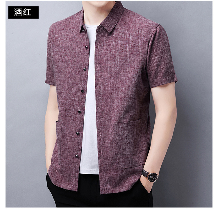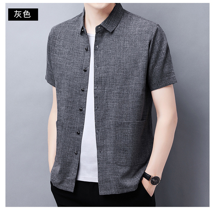 夏季新款男士衬衫短袖仿亚麻中年男装半袖衬衣薄款纯色短袖衬衫男