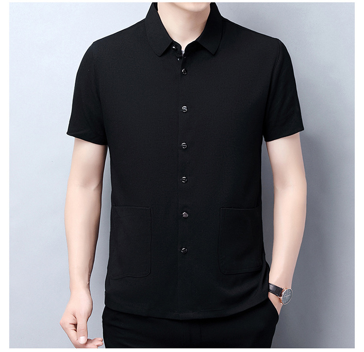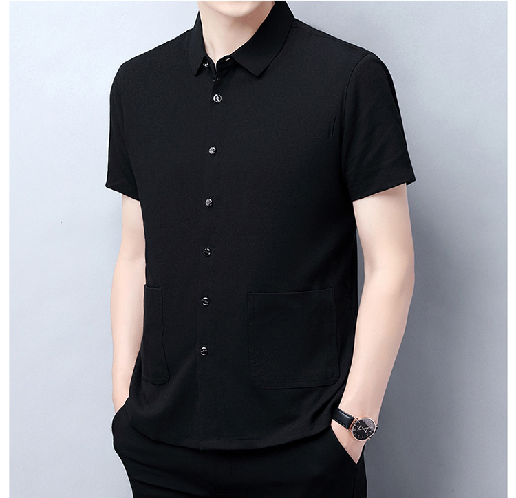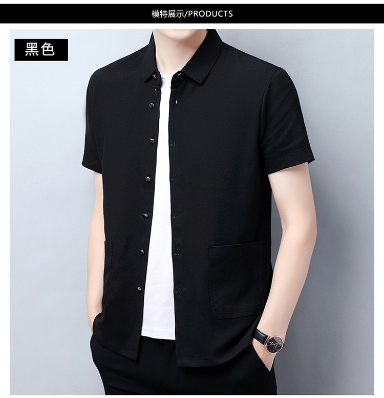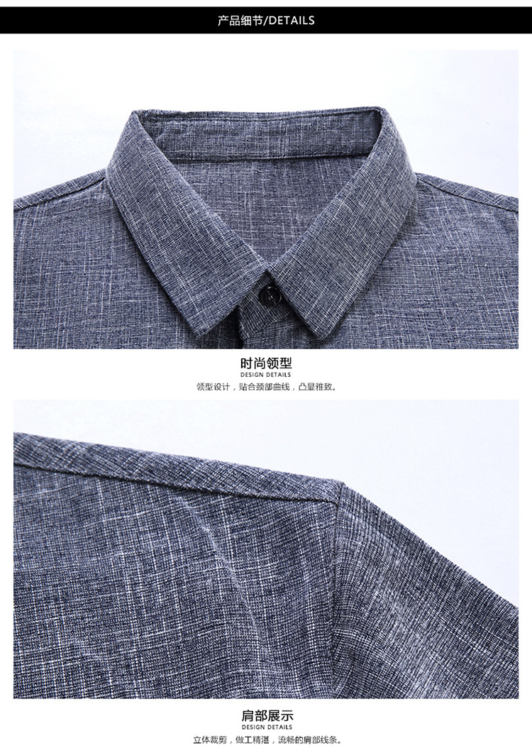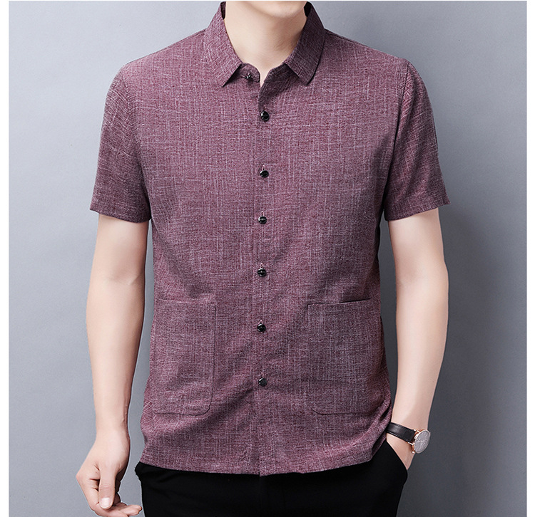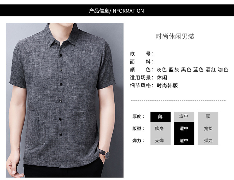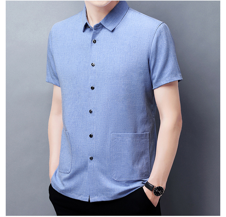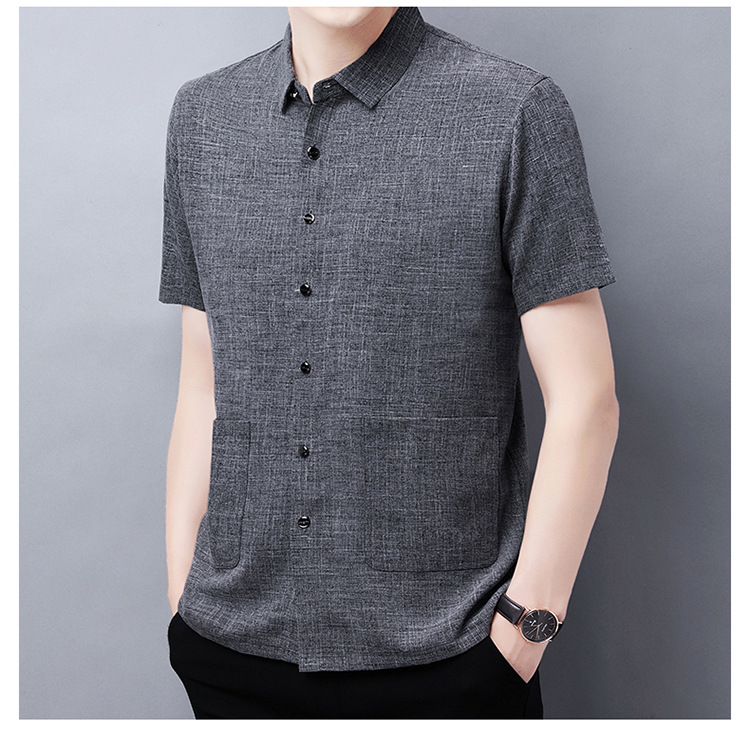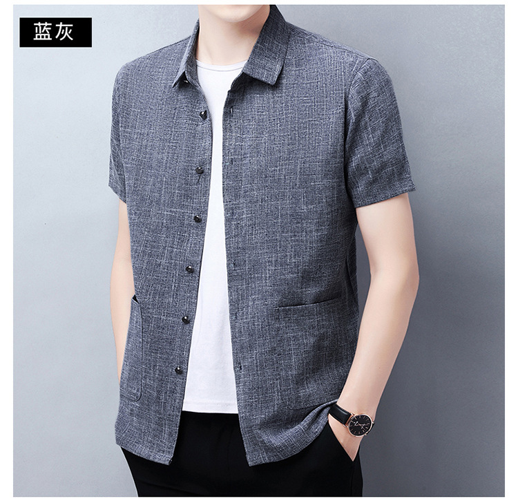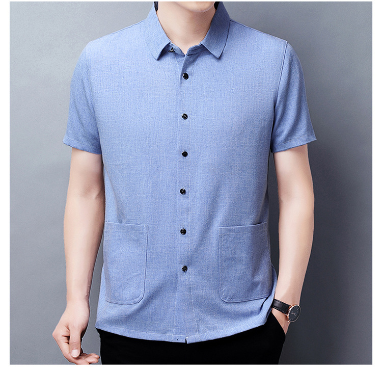 夏季新款男士衬衫短袖仿亚麻中年男装半袖衬衣薄款纯色短袖衬衫男