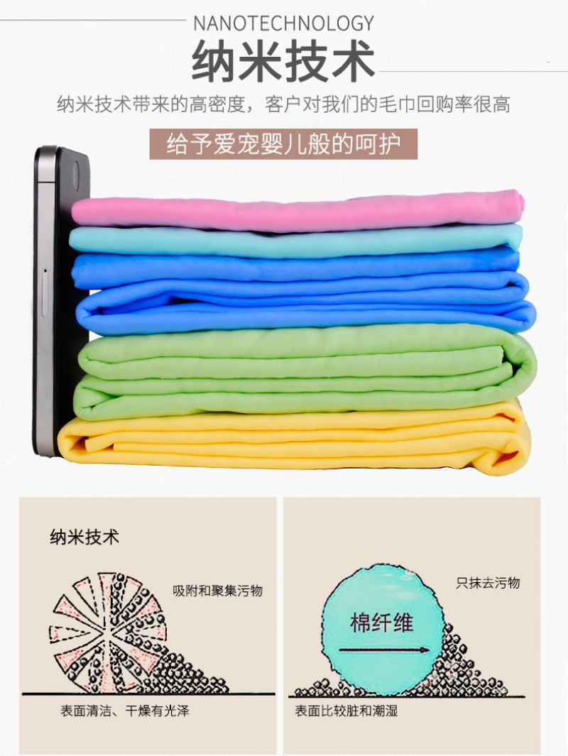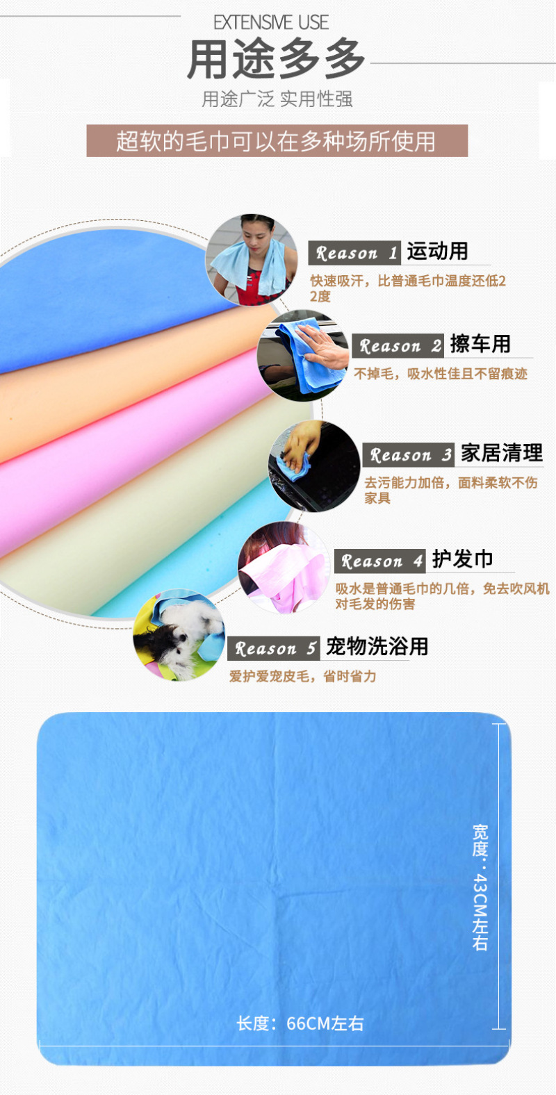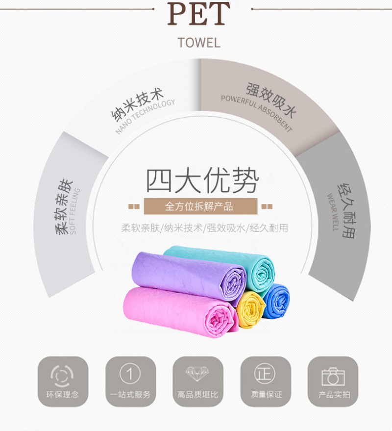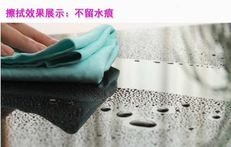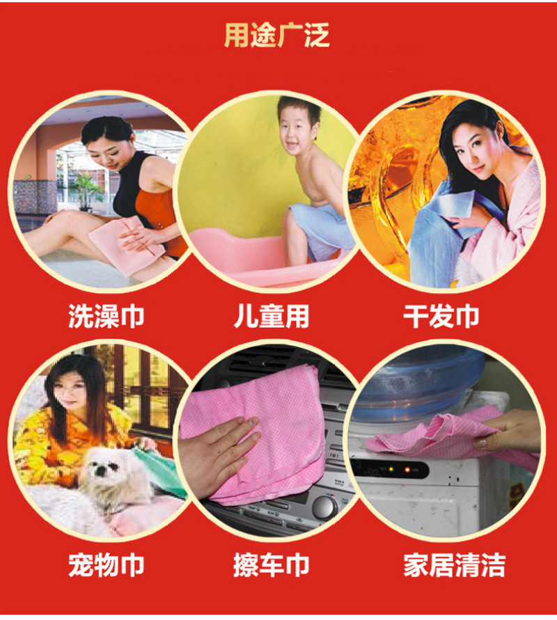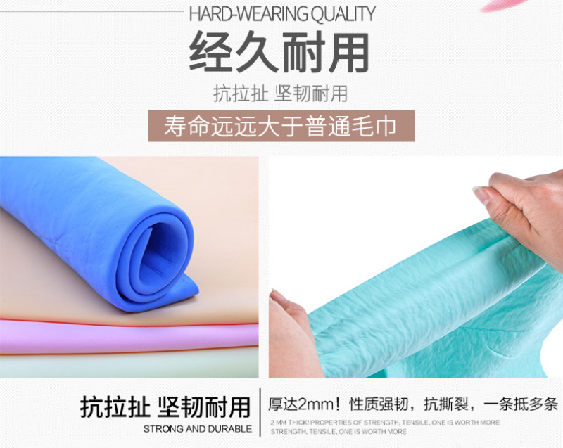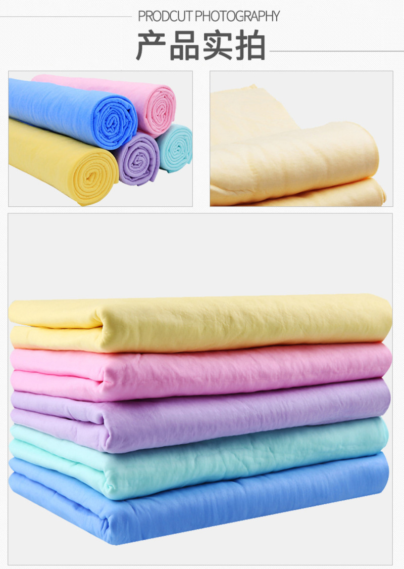 人体用仿鹿皮巾采用了PVA特殊防霉抗菌处理,质地柔软不掉棉絮,具有微细结构,利用毛细现象将物体表面的水迅速吸干,因而具有强大的吸水力,洗完头轻擦几下即可将头发擦干九成.已风靡欧美多年,成为科技时代新生活的日用必需品。你看今年雅典奥运会上各国跳水健儿出水后都是有仿鹿皮巾擦头呢. 特点: 1.强大的吸水能力。 2.柔软细腻的触感。 3.性质强韧,能抗拉、抗撕裂,一条抵十条。 4.环保PVA材料制造,干燥时呈硬块状,以阻止病菌入侵和繁殖 用途: 可用于洗澡、擦头、运动、宠物及高档居家物品的清洁。 1.婴幼儿:宝宝澡后擦头可达九成干,即使在寒冷的冬季,等宝宝穿完衣服,头发已全干了,宝宝安然入睡。妈妈们再不用担心宝宝会感冒!也再不用担心电吹风的噪声会损伤宝宝娇嫩的听力! 2.女士:女士们洗头再不用考虑晚上是否能干,充分享受浴后即睡的自由和快乐! 3.出差人士:出差时将合成鹿皮巾放进本包装罐中,既可避免使用宾馆的毛巾,又不会象普通湿毛巾那样在旅途中发霉、变味或浸湿旅行包内其他物品。 4.老年人:老年人正气渐虚,洗头后容易感冒,合成鹿皮巾正可解决老年人的后顾之忧。 5.运动时:合成鹿皮巾与皮肤接触处比一般毛巾可低2℃,比一般毛巾凉爽,是运动、健身时携带的佳品。 6、爱车配张鹿皮巾,时尚又实用! 7、宝宝突然在床上尿尿了,用来快速吸尿,抢救垫褥用鹿皮巾非常不错的。 使用方法: 1.新开启时,请先用清水揉洗本品10秒钟,去除保湿剂,拧干使用。 2.本品干燥时呈硬块状,使用前于水中浸湿即变柔软,拧干即可使用。 3.如需持续使用,放入本包装罐内即可保持柔软。