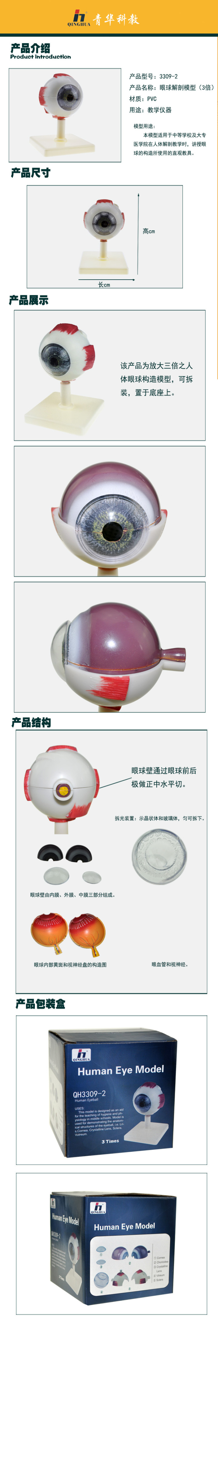 模型适用于中等学校及大专医学院在人体解剖教学时,讲授眼球的构造所使用的直观教具。