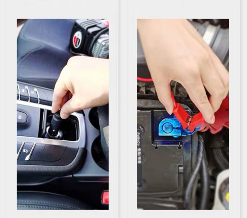 2、取出电源线电瓶夹(不带点烟器插头),直接夹在电瓶的正负2级,切忌碰线短路,打开开关,即可充气。(双缸充气泵功率大,不可通过转换器直接插在点烟器上取电,容易烧坏车上点烟器及线路)