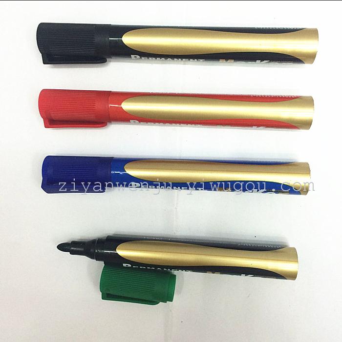 产品特点:油性记号笔,有园头和斜头,颜色黑色.蓝色.红色.绿色,可在光滑表面,纸张、木材、金属、塑胶、陶瓷上做记号,永久不褪色,书写流畅,书写后盖紧笔帽,防止墨水蒸发。
