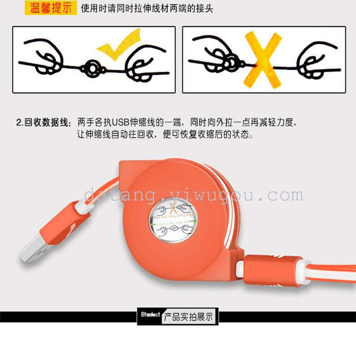 特点:颜色搭配协调,外观造型非常新颖。数据线可拉伸或是收缩,方便携带与放置 ,多系列插口支持,非常适用于身上携带多部手机的使用人群