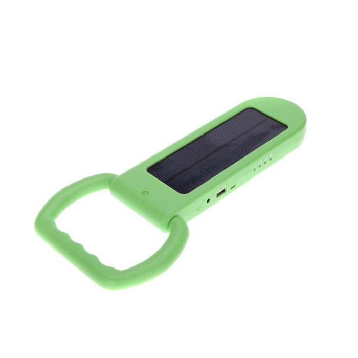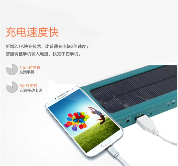 将产品放在阳光可以直射的地方,当光强达到一定程度时,即可为产品充电。此外,也可以用5V/1000mA输出的适配器为本产品充电。充电时,侧面的蓝色LED闪烁,用以指示充电状态及电量。当充满电后,4颗LED全亮。