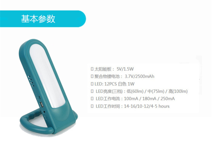 本产品是一款集照明、充电于一体的便携式太阳能灯具。高效太阳能板可将太阳能转化为电能储存在灯具内部,不仅可用于照明,也可以作为移动电源,为手机、相机等电子产品充电。角度可调整的支架,方便平放、悬挂或手持。本产品不仅可用作庭院、楼道等场所的辅助照明设备,更是户外运动、旅行探险的理想伴侣。
