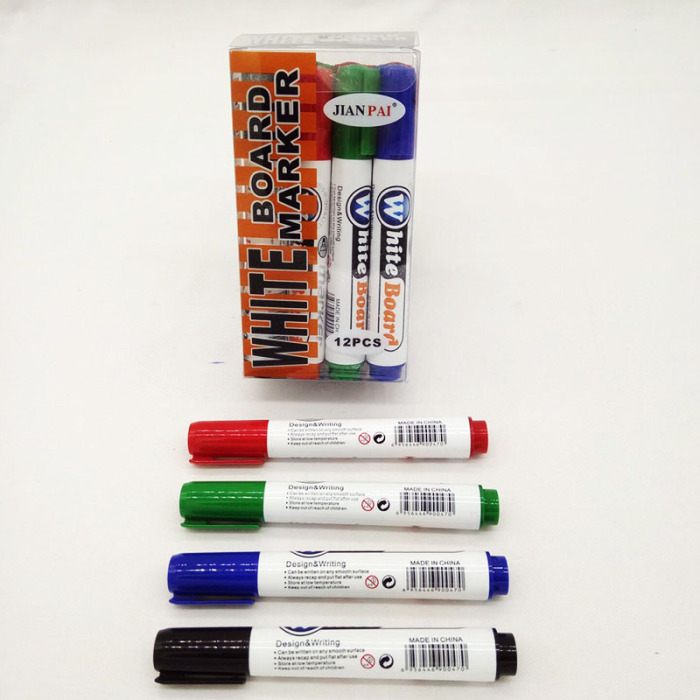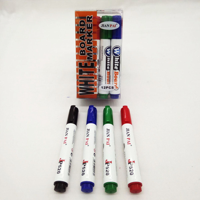 箭牌520-12支PVC盒装白板笔材质PP料生产,不易开裂,颜色有绿色、黑色、红色、蓝色,无毒环保墨水、符合安全标准、墨色鲜明、易擦、不留痕迹、好写耐用。使用安全性无粉尘、无污染、书写流畅、顺滑、颜色明亮、字迹清晰、质量保证。白板笔适用于中小学校、大专院校,各类培训机构的教学工具;企事业单位、行政机关,会议室里的办公工具,可在各种白板上书写记号使用后请盖紧笔帽。