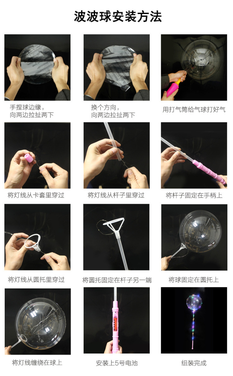 先把电池装在手柄上,再用打气筒把气球打满气【气球直径达到35公分左右哦】尾巴拉长后直接打结一次(结拉紧,不要扎绳子哦】不干胶贴纸贴在气球上,然后灯线通过管子和托盘穿出后十字打结捆绑在气球上,最后把气球尾巴塞进托盘的挂勾上加以固定即可。