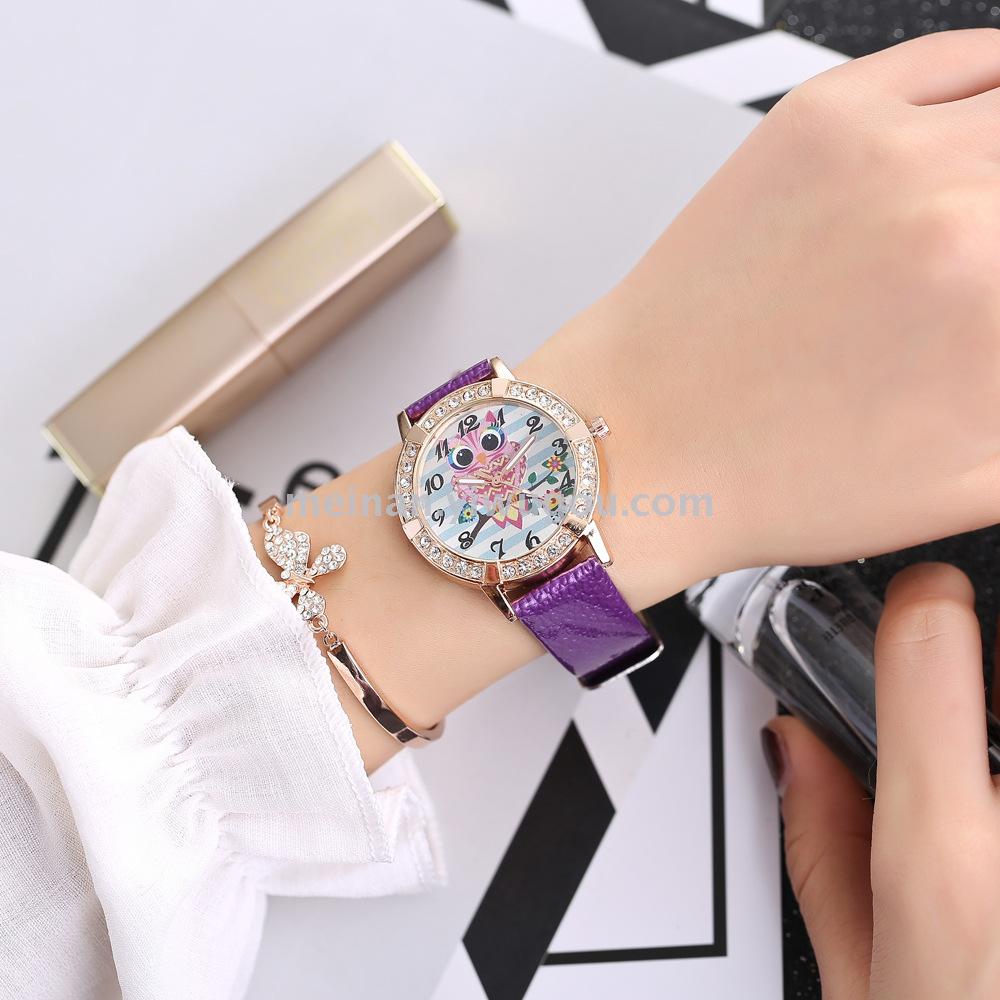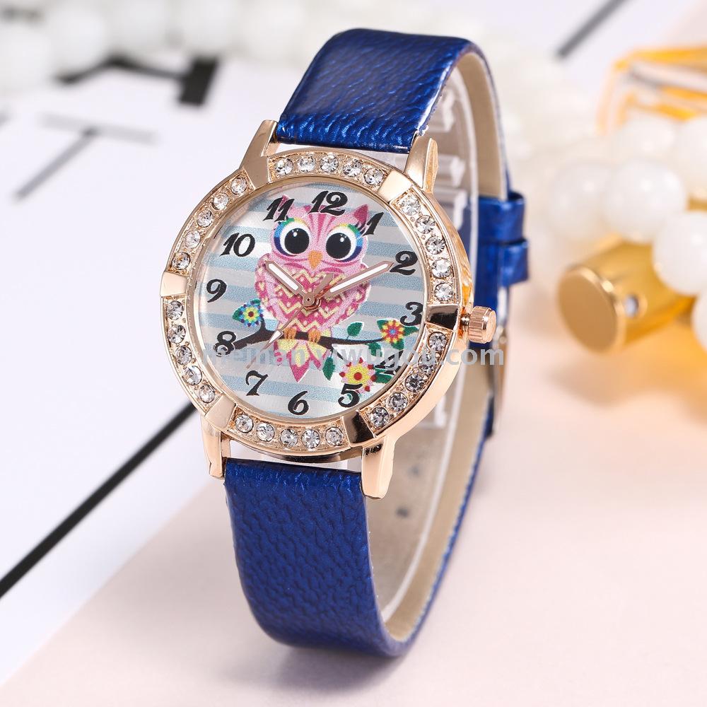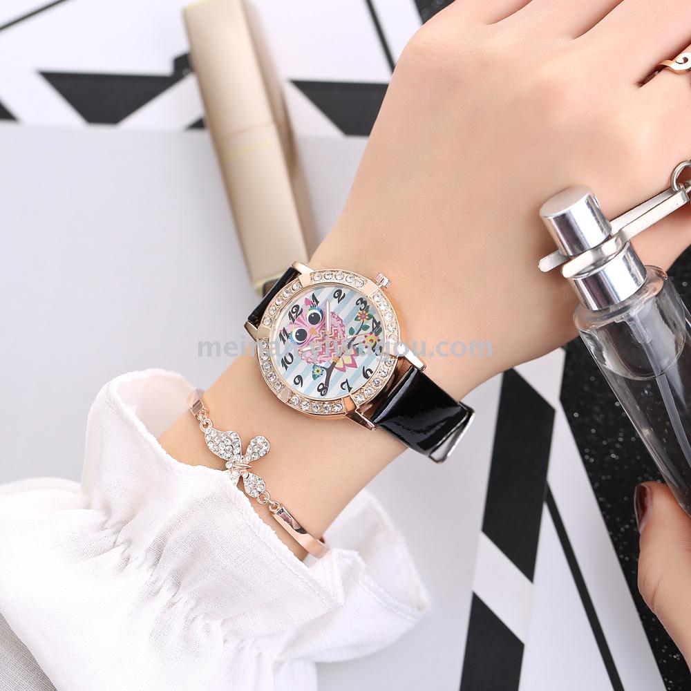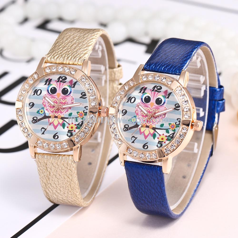 wish热卖休闲皮带手表 呆萌粉色猫头鹰卡通女士石英表