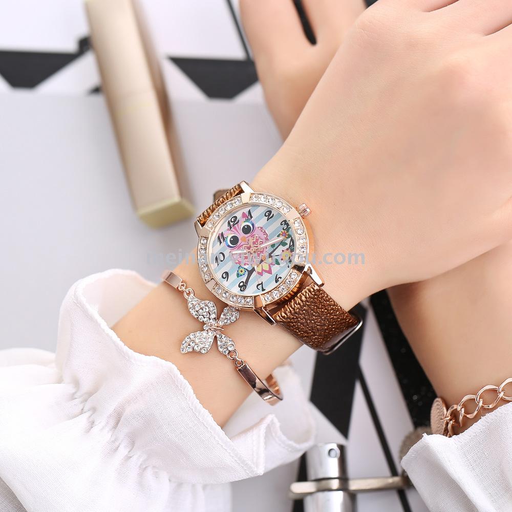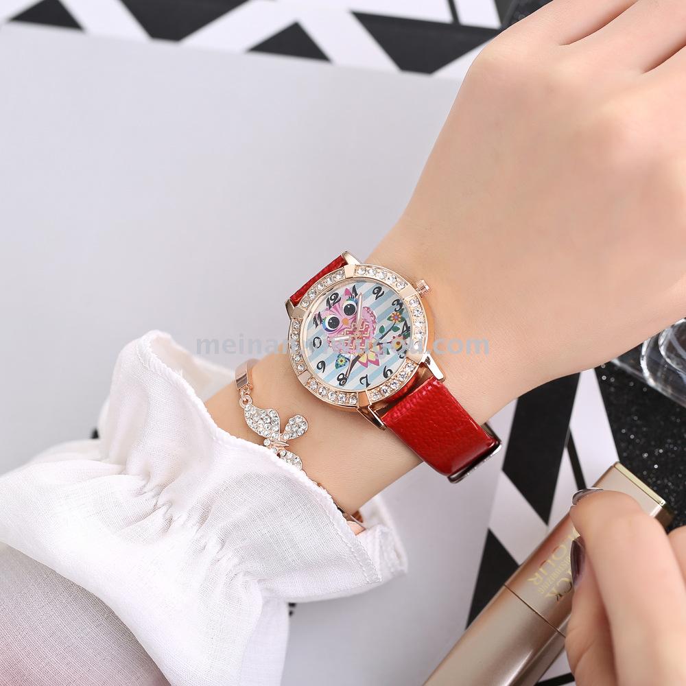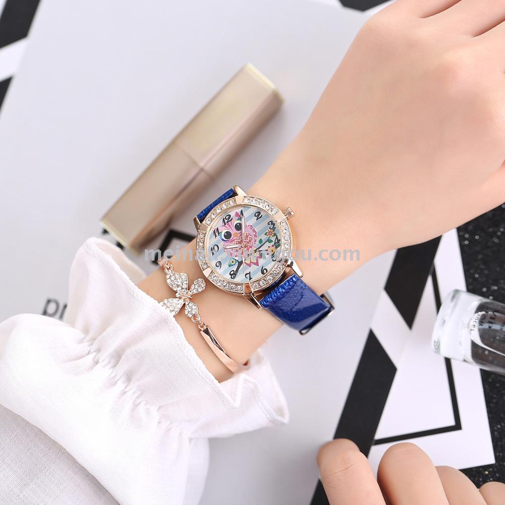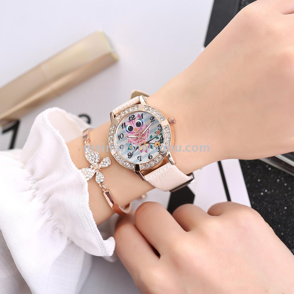 wish热卖休闲皮带手表 呆萌粉色猫头鹰卡通女士石英表