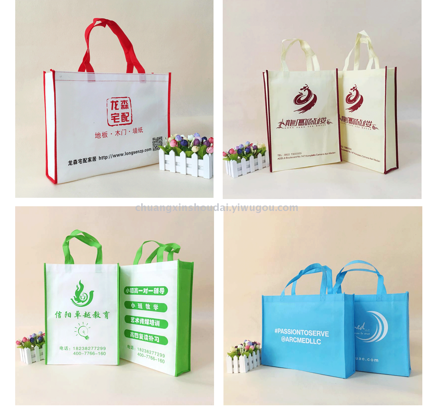 义乌创新手袋商行是一家开发设计制作与一体的实力工厂,生产无纺布袋、牛皮纸袋,白卡礼品纸袋,礼物盒,pvc透明包装、涤纶袋,帆布袋,翻盖纸袋、面包袋,镭射纸袋,PP礼品袋,毛毡布袋,草莓袋,塑料包装、纸品包装.pp广告扇,学生用多功能包,风琴包,资料册,文件袋,文件夹,笔袋。防水画画衣,围裙等产品 。 欢迎各位新老客人的下单定制,为客人设计做样.打样.为客人献上最真诚的服务!