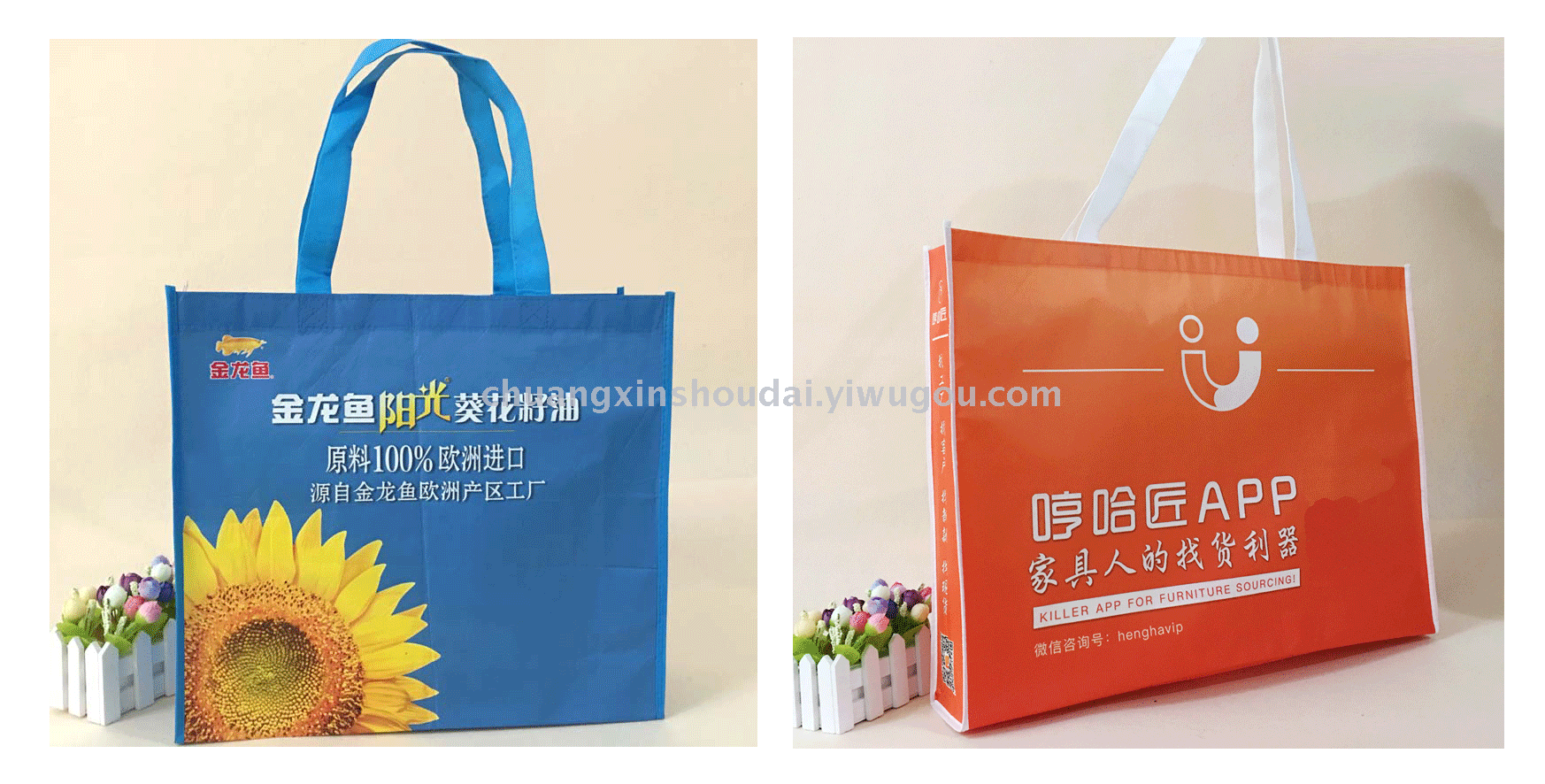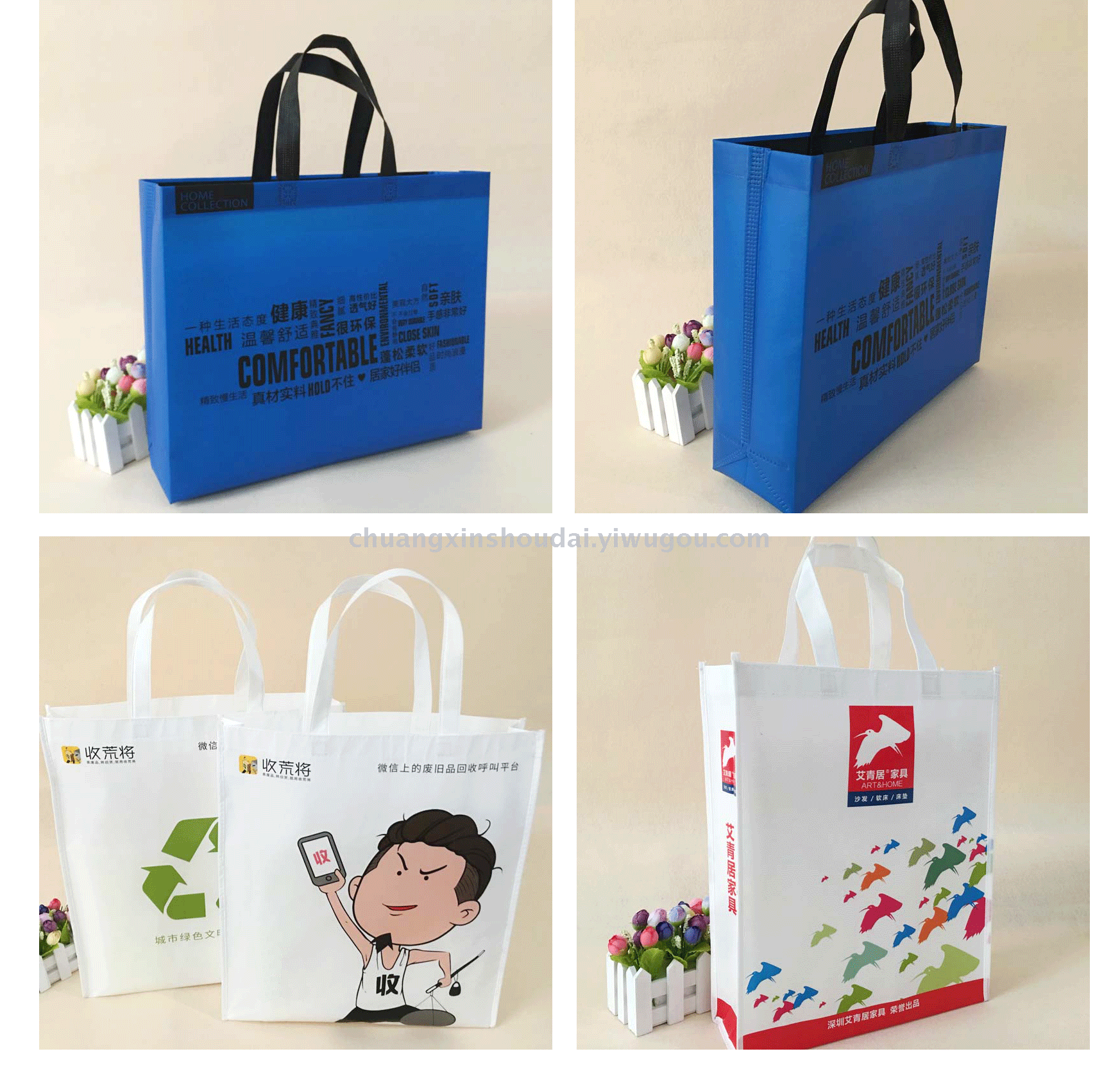 义乌创新手袋商行是一家开发设计制作与一体的实力工厂,生产无纺布袋、牛皮纸袋,白卡礼品纸袋,礼物盒,pvc透明包装、涤纶袋,帆布袋,翻盖纸袋、面包袋,镭射纸袋,PP礼品袋,毛毡布袋,草莓袋,塑料包装、纸品包装.pp广告扇,学生用多功能包,风琴包,资料册,文件袋,文件夹,笔袋。防水画画衣,围裙等产品 。 欢迎各位新老客人的下单定制,为客人设计做样.打样.为客人献上最真诚的服务!