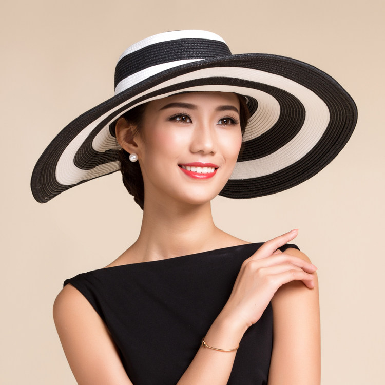 防紫外线大沿黑白条纹可折叠夏时尚女帽批发
