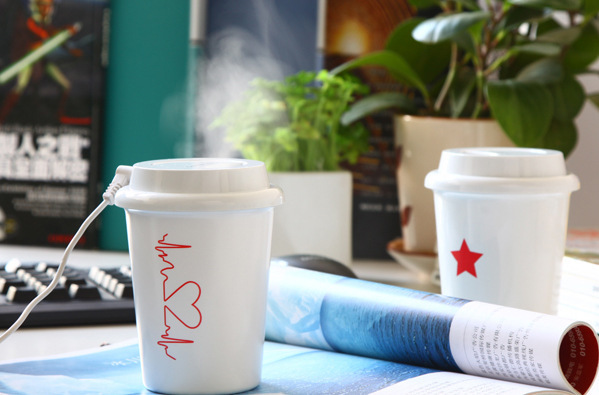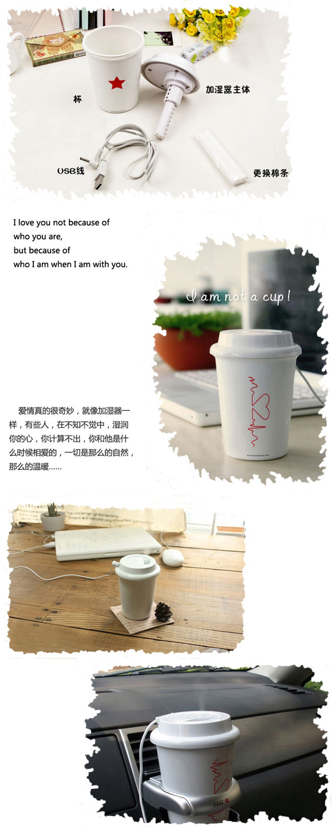 标准配件:主机,彩盒包装,USB电源线(1.2米) 产品尺寸:8.7*8.7*11.6CM 包装尺寸:9.5*9.5*12CM 产品净重/毛重:132G/205G 装箱数量:60pcs/箱 外箱规格:49X30X50CM 加湿器功能: 超声波/负离子/喷雾加湿 加湿器外形: 经典咖啡杯/水杯型 电源方式: 电脑USB|电源适配器|车载充电器 DC5V/120mA功能 使用时间:一次加满水220毫升左右,可以持续使用8-10小时