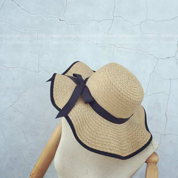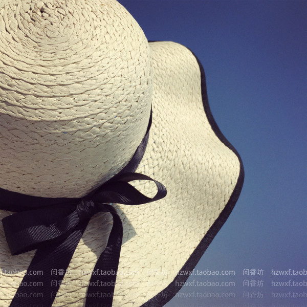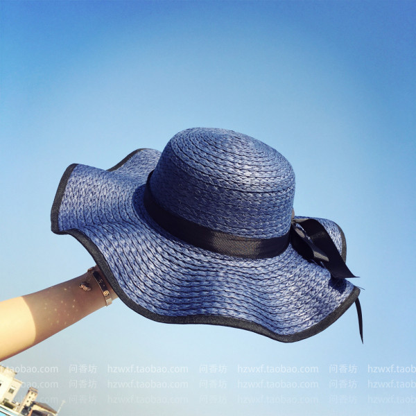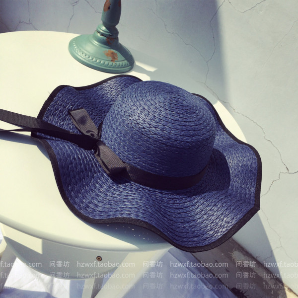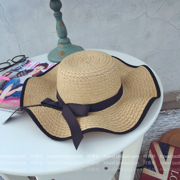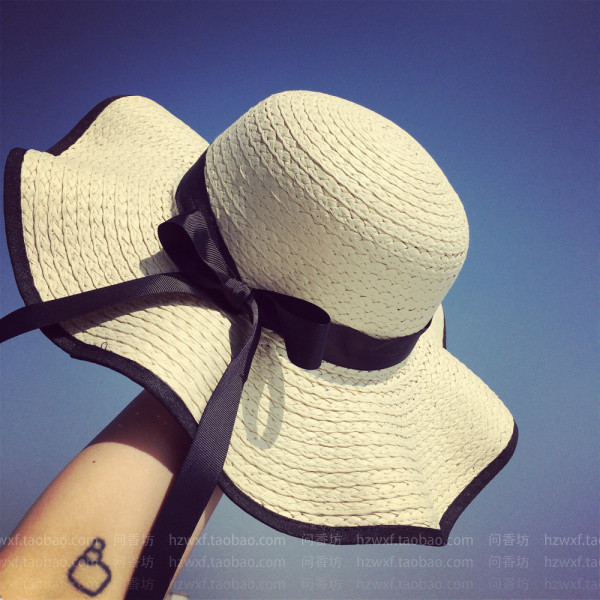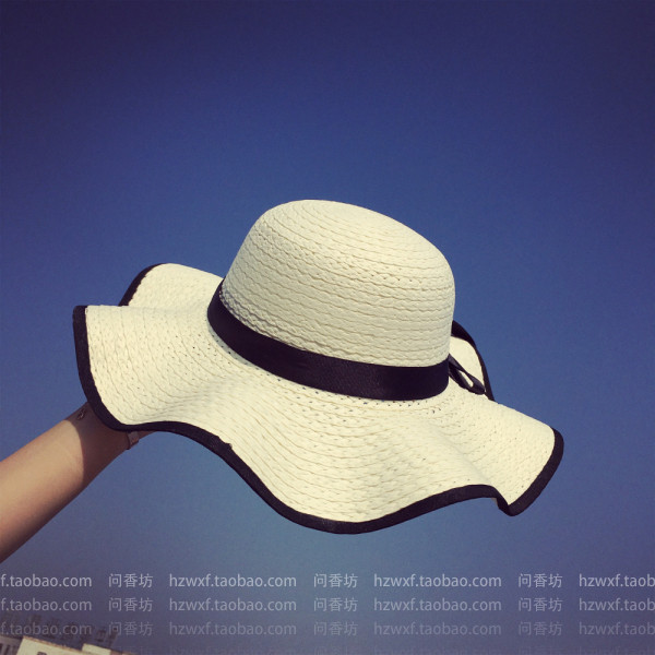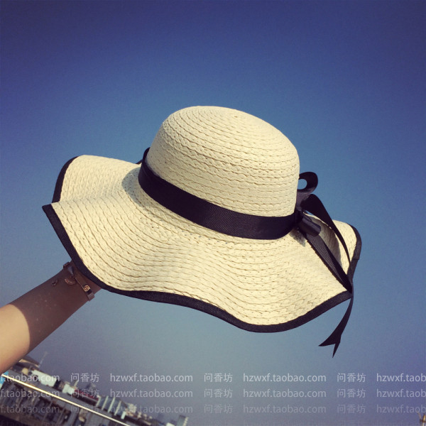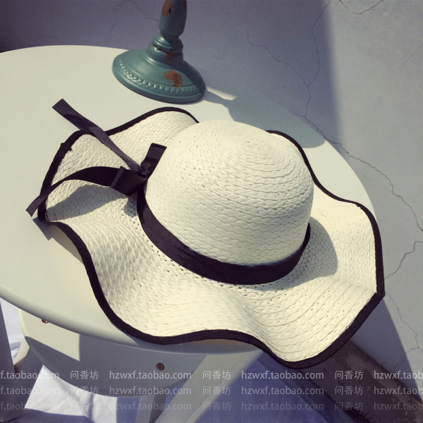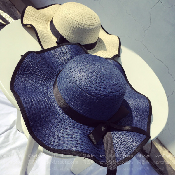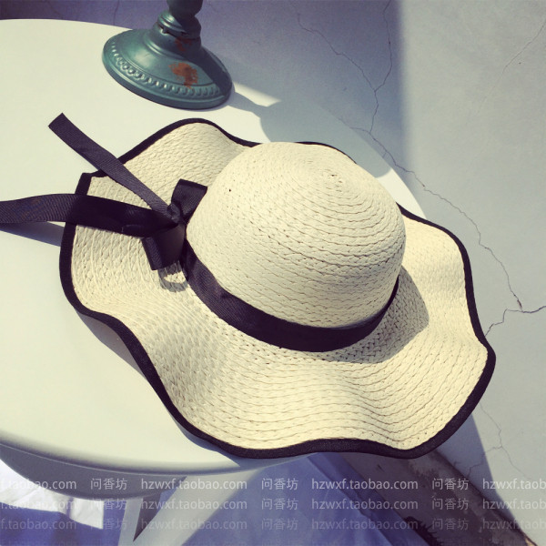 韩国新款夏季女士草帽蝴蝶结沙滩帽波浪帽子户外登山大檐太阳帽女