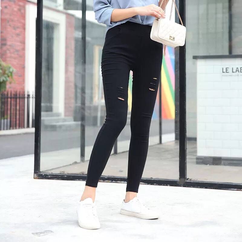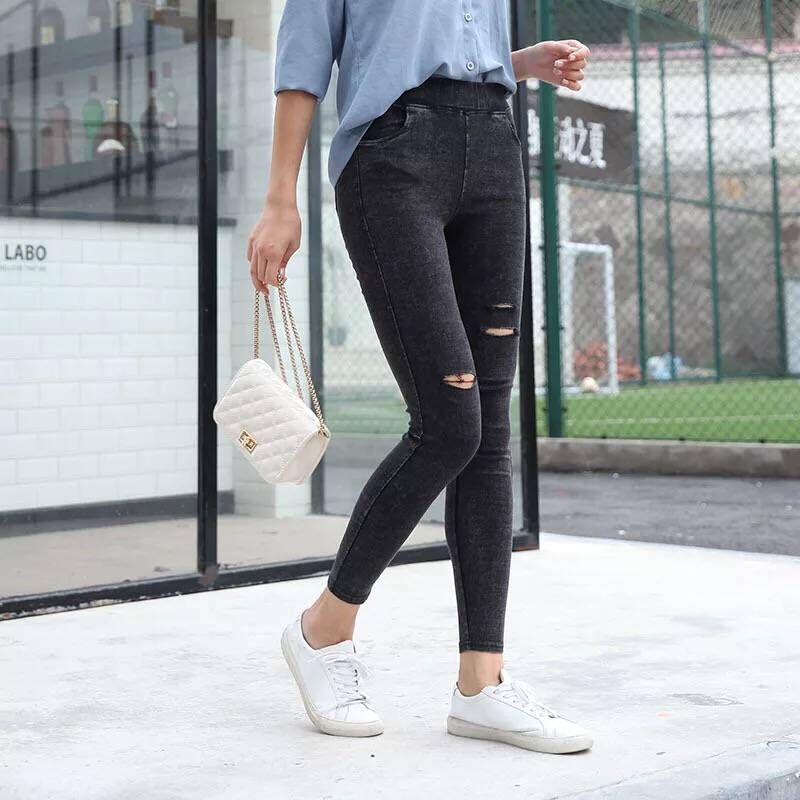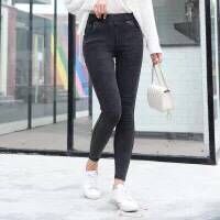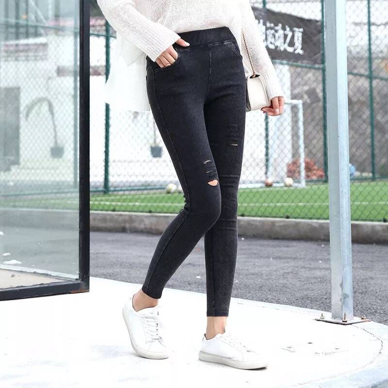 仿牛仔裤破洞女高腰打底裤外穿大码小脚裤黑色铅笔裤春秋季长裤女