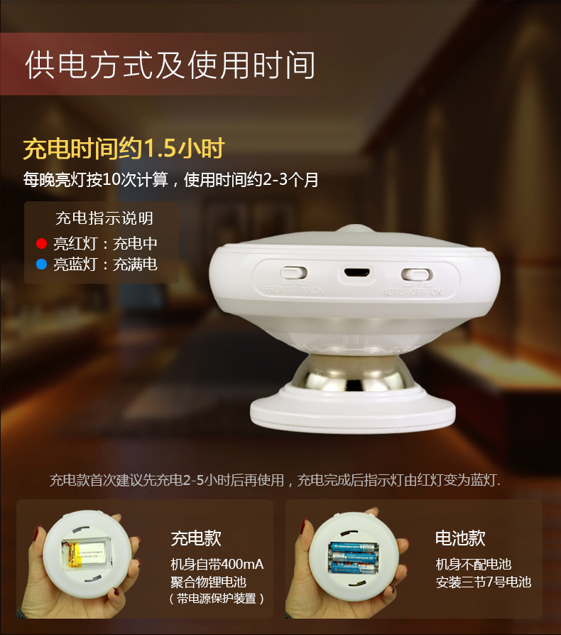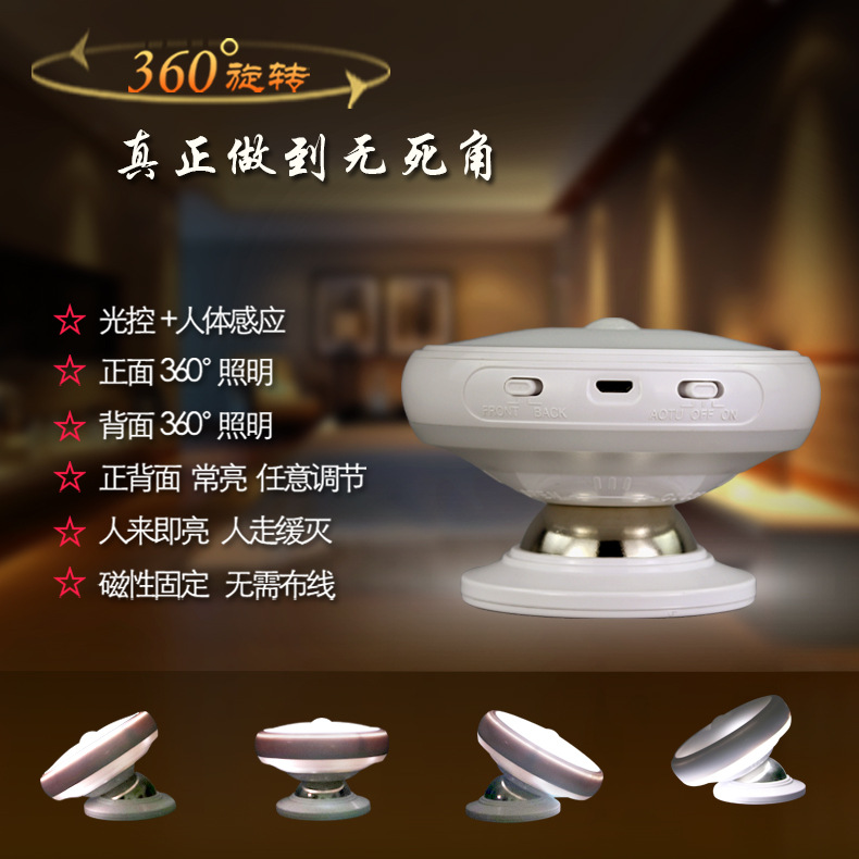正面360度照明 背面360度照明 常亮 关闭 感应三种模式任意调节