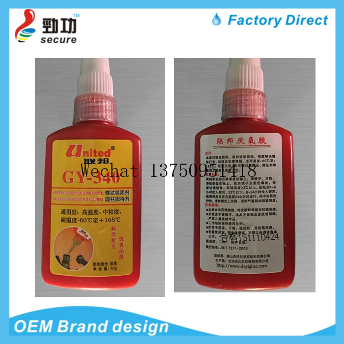 厌氧胶是一种单组份,高粘度、高强度的螺纹锁固密封剂。本品在两个紧密配合的金属表面间,并与空气隔绝时固化,避免螺纹紧固的松动和渗漏。具有耐热、耐压、耐低温、耐药品、减震、防腐等性能特点,室温固化速度快、强度高、节省能源、收缩率小、密封性好,胶缝外溢不固化,易于清除。 |