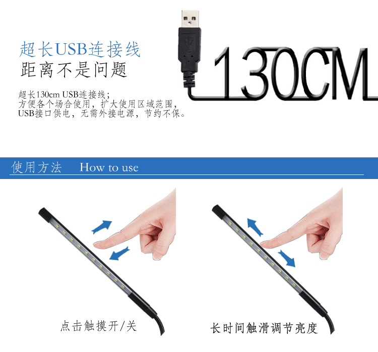 | 可夹厚度3.3cm | 使用方法:点击触摸开/关,长时间触滑调节亮度 |
