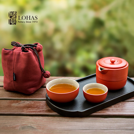 陆宝陶瓷旋纹旅行茶组快客杯一壶两杯布袋茶具