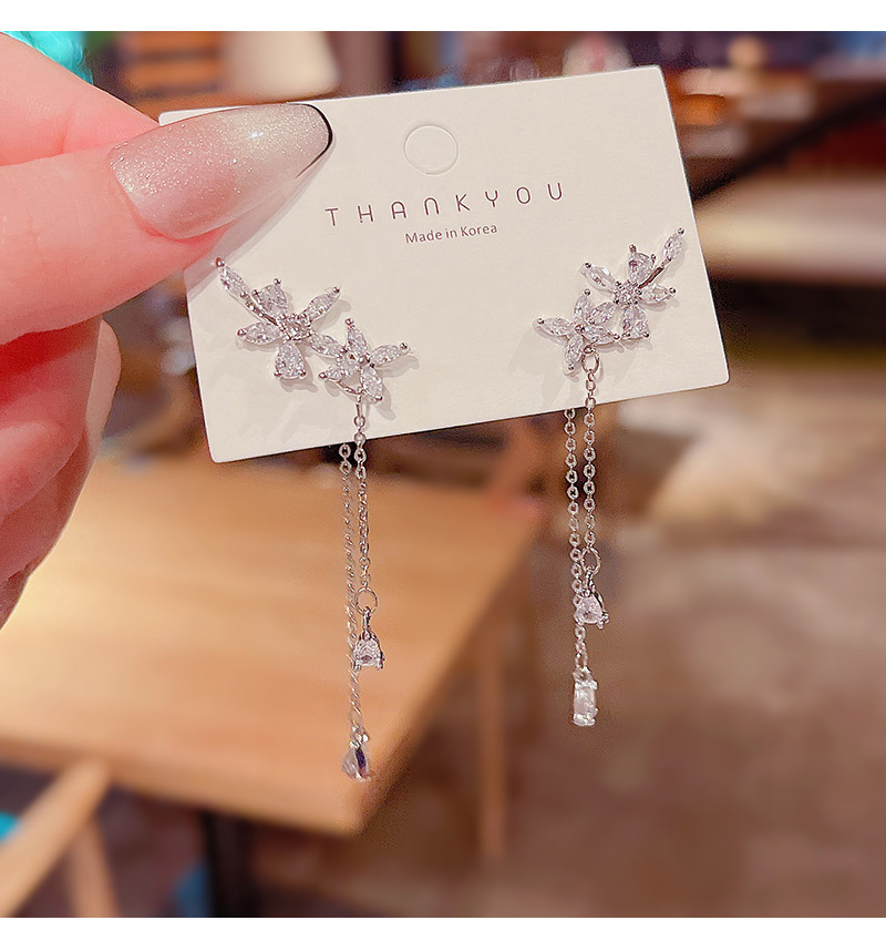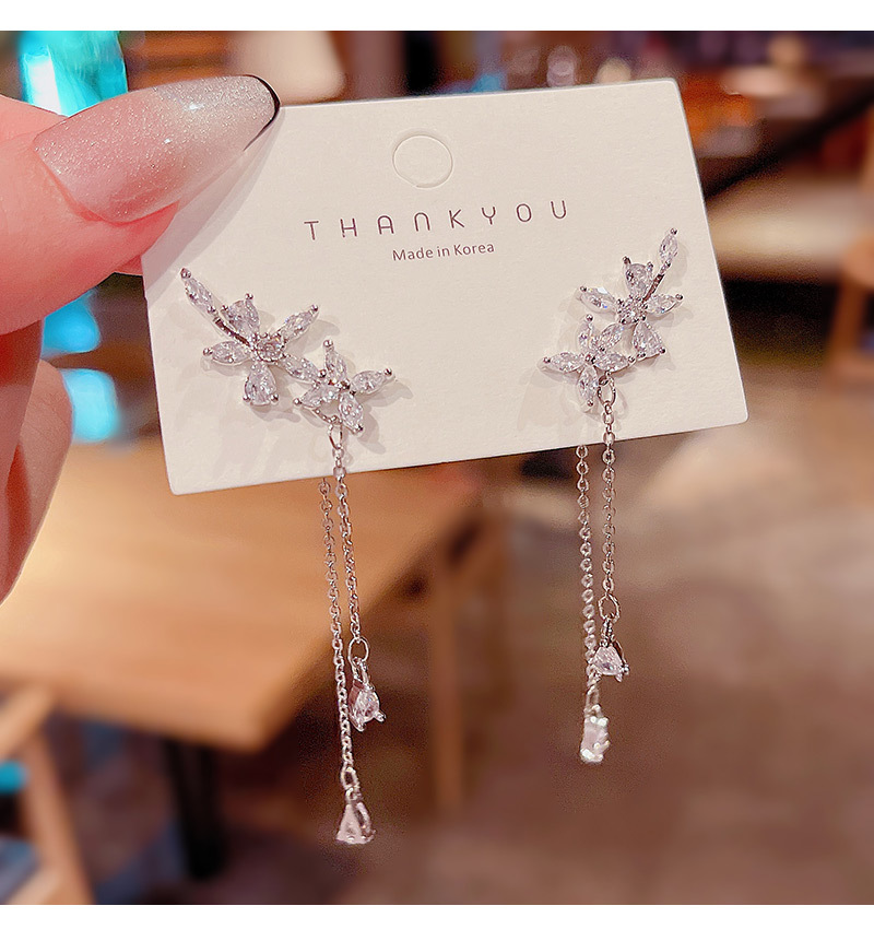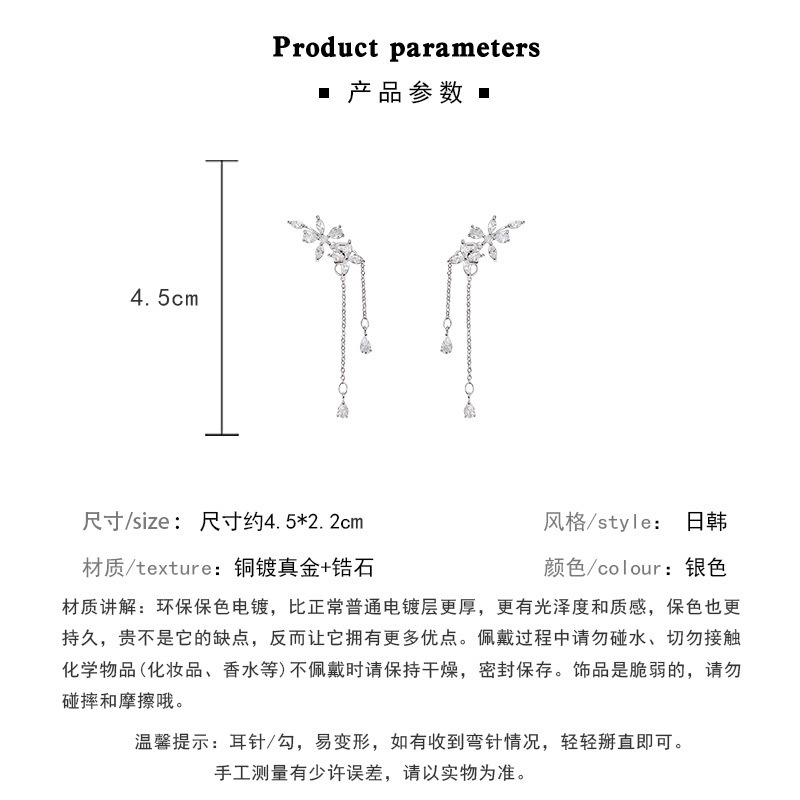 饰品S925银针韩版超闪锆石翅膀耳环女高级设计感长款流苏耳钉耳饰