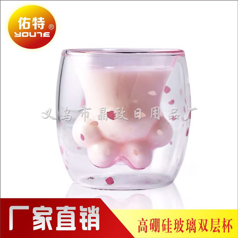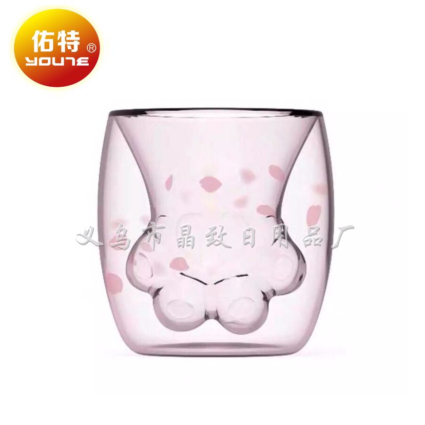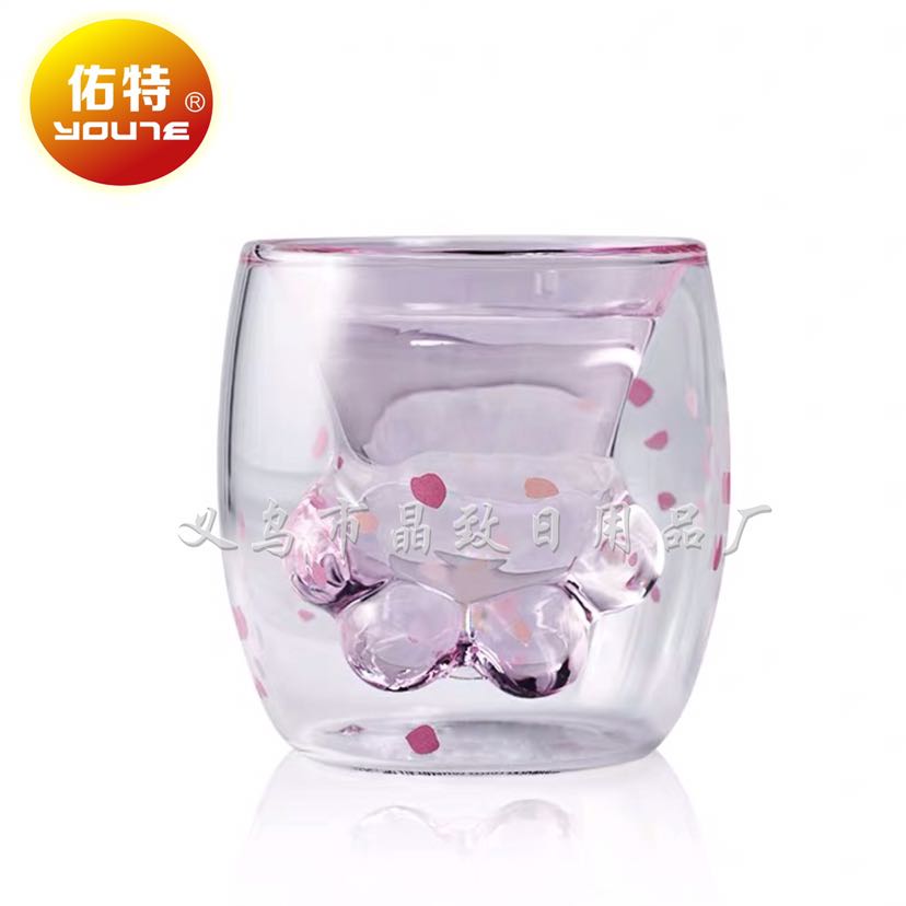 粉色樱花猫爪杯高硼硅双层玻璃杯