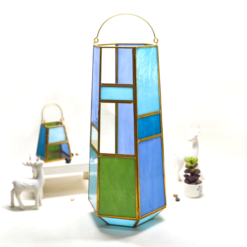 外贸专供特大号6边形手提彩色玻璃花房风灯