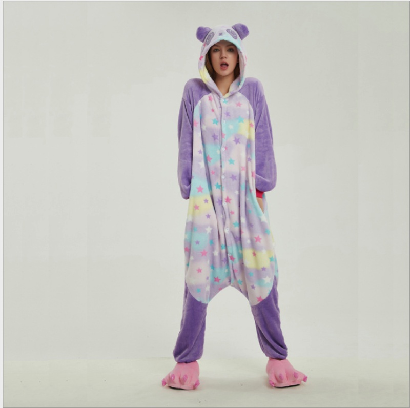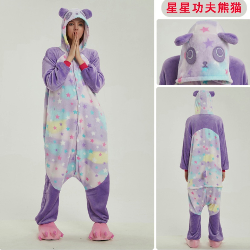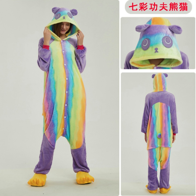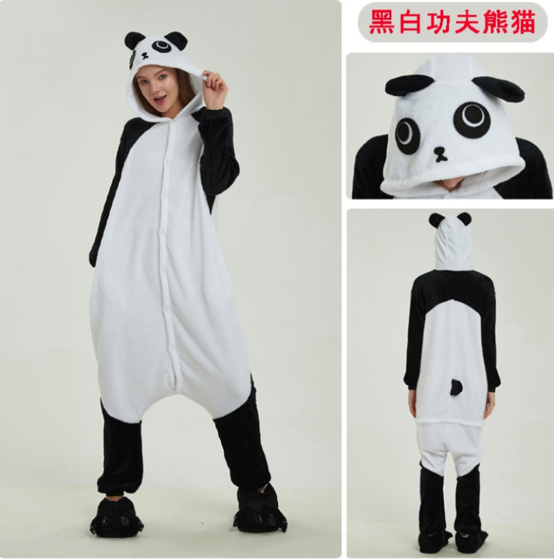 新款出口外贸法兰绒卡通动物连体睡衣彩色功夫熊猫男女情侣