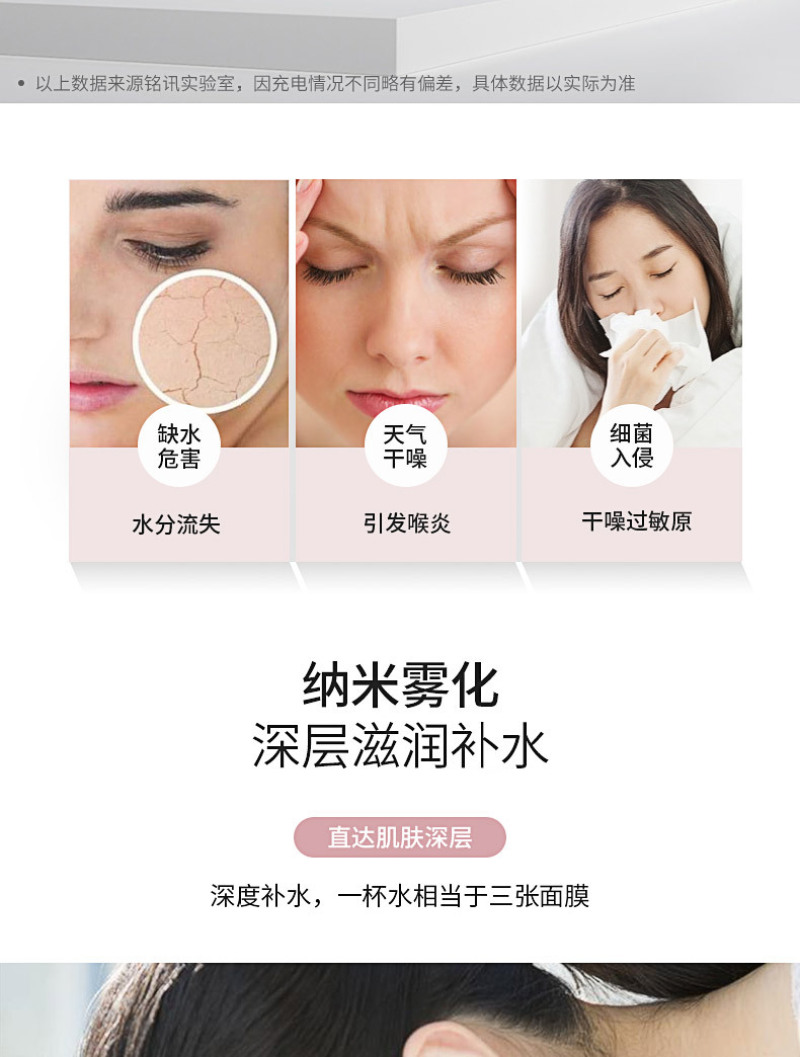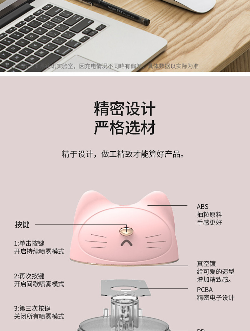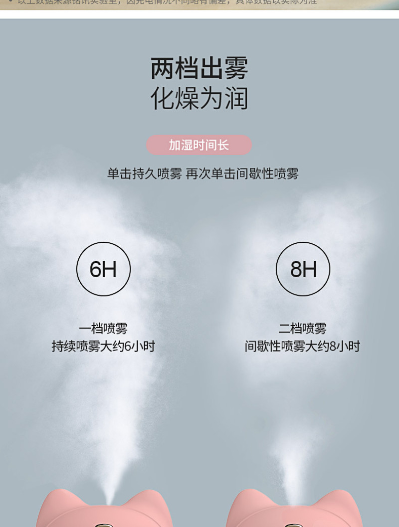 喷雾操作说明:1:单击按键,开启持续喷雾模式 2:再次按键,开启间歇喷雾模式(喷雾3秒 停止3秒) 3第三次按键关闭所有喷雾模式