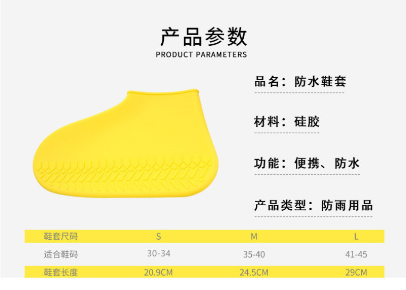 1.防水鞋套,采用优良的食品级硅胶材料,具有良好的防水性和防滑功能,产品安全、环保、耐用。同时由于硅胶自身的特性,产品容易清洁,您可以直接用清水清洁,也可以直接用肥皂水清洁,清洁完后晾干即可。