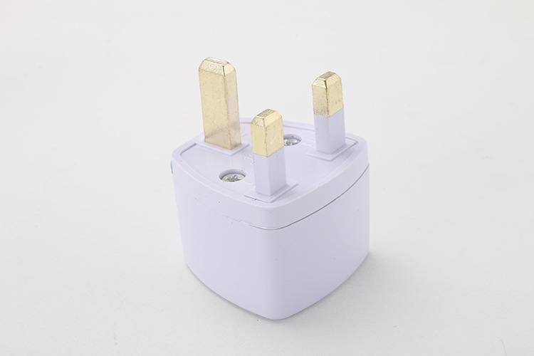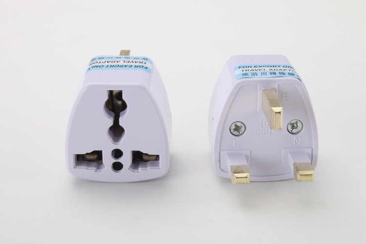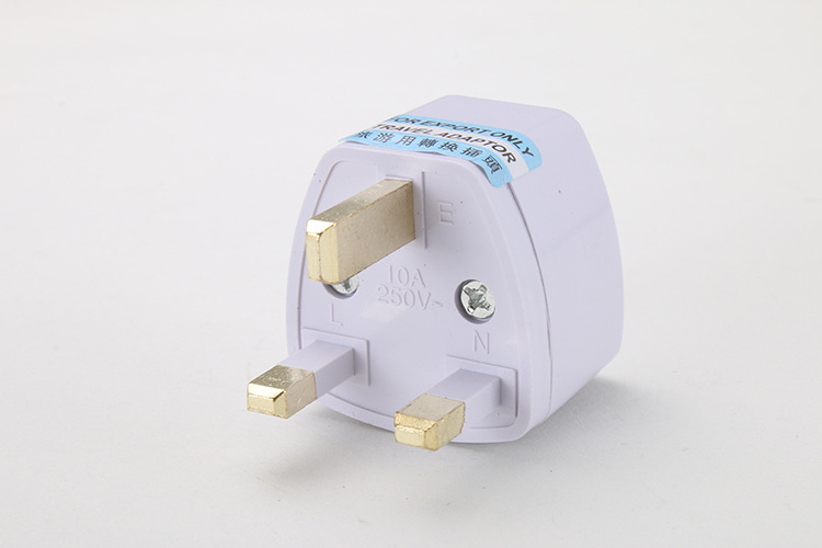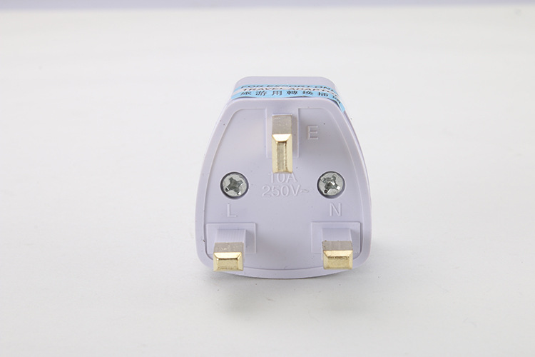 产品名称:英规转换接头 产品材质:ABS阻燃材质+铁片镀锌 适用范围:香港和英国、印度、巴基斯坦、新加坡、马来西亚、越南、印度尼西亚、马尔代夫、卡塔尔等国家和地区使用 产品功能:各国插头的转换 产品规格:0~250V 10A 1000W 可选颜色:灰白色 产品重量:24g 产品包装:20个/盒 1000个/箱 38*34.5*41cm 26kg/箱