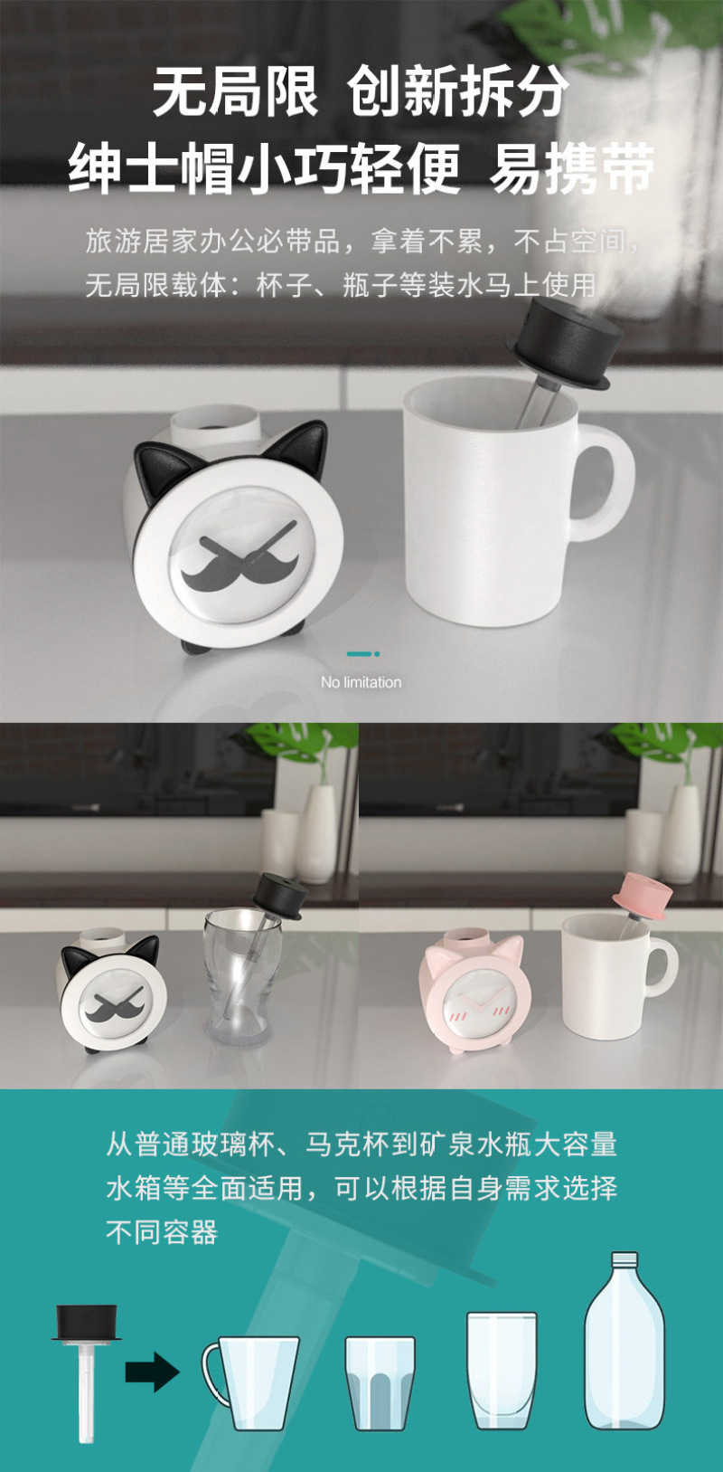帽子可以拆开挂在杯子边上或者放入普通矿泉水瓶直接使用,所有功能均可正常使用,注意不要将帽子部分整个浸入水中。