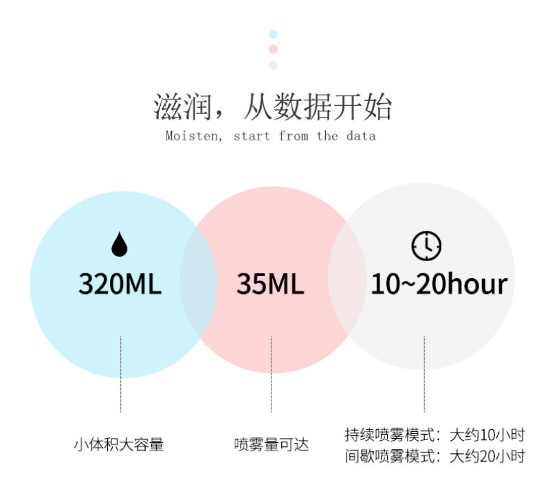 【注意事项】:这款产品是加湿器,材质跟结构不适合做香薰,如果加精油,可能会损坏产品的使用寿命。加湿器的水建议用自来水,因为蒸馏水经过蒸发,纯净水经过提取,改变了原有的水质。