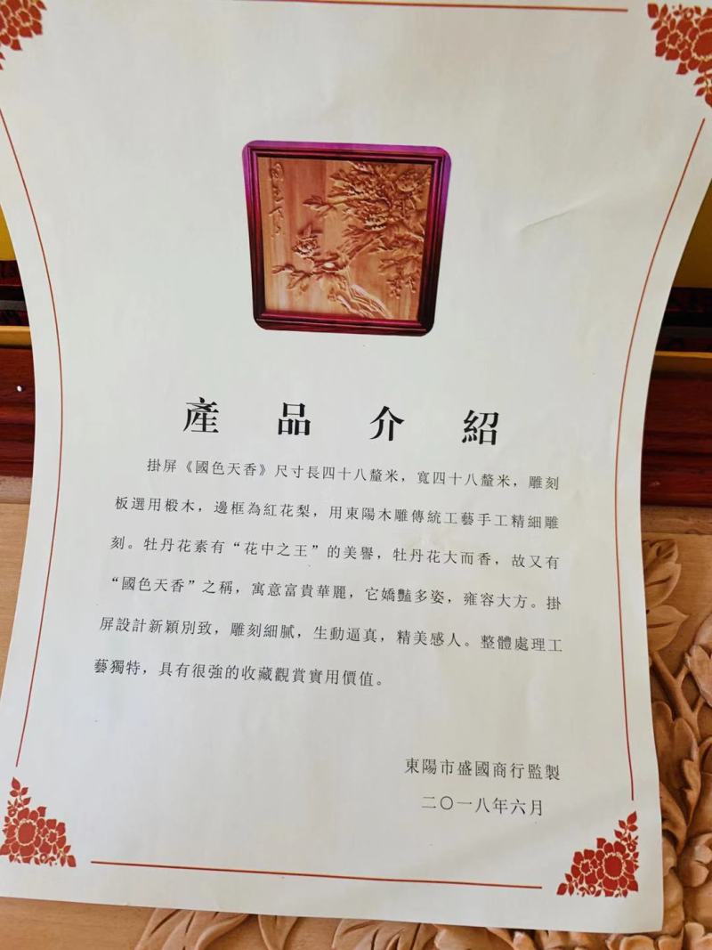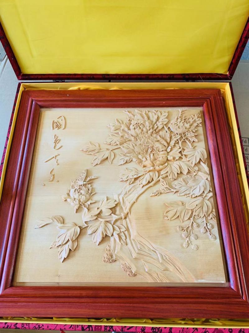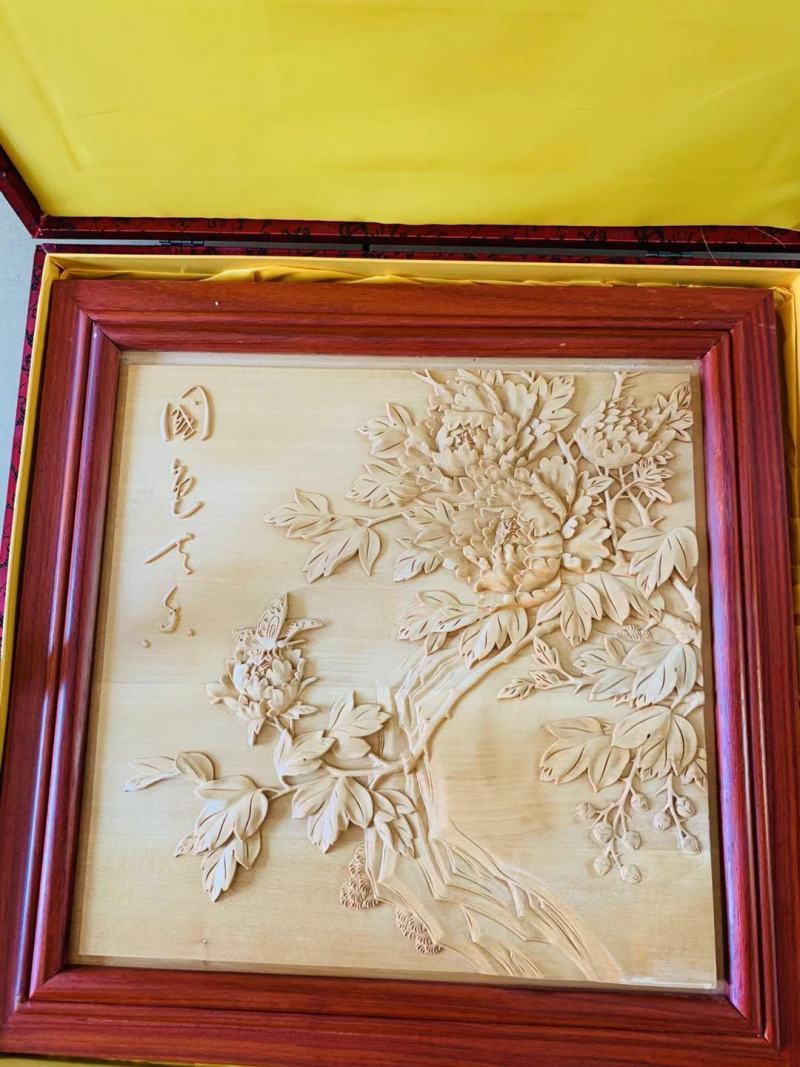 红花梨木国色天香挂屏,原31880元,手工制作,做工精细,是私家收藏的,尺寸48×48cm,雕刻板用椴木,边框为红花梨木,挂屏设计新颖别致,雕刻细致,生动逼真,精美感人,整体工艺独特,具有很强收藏欣赏价值,具体不介绍了,具体的直接联系18857917188,请确认,请安排,请联系
