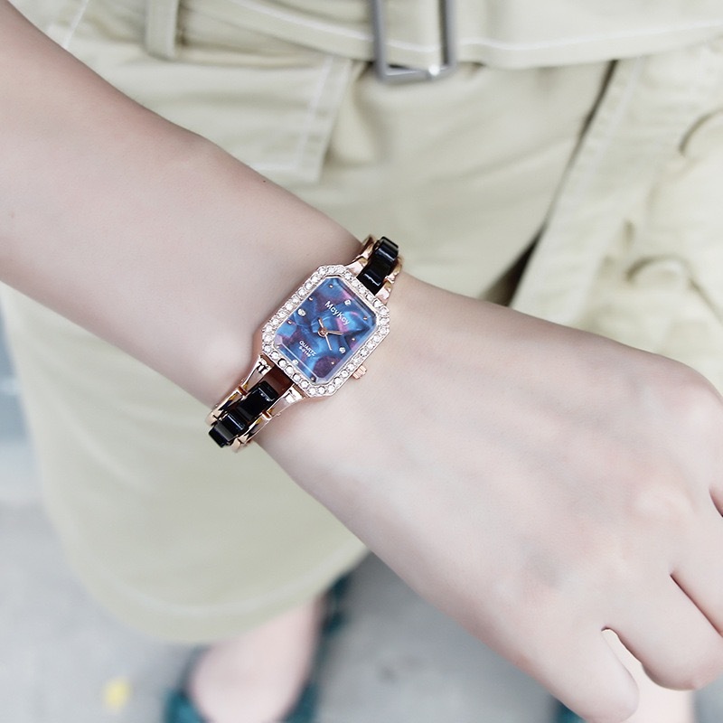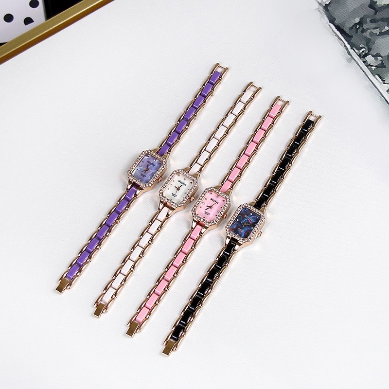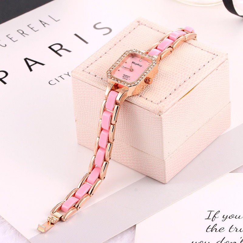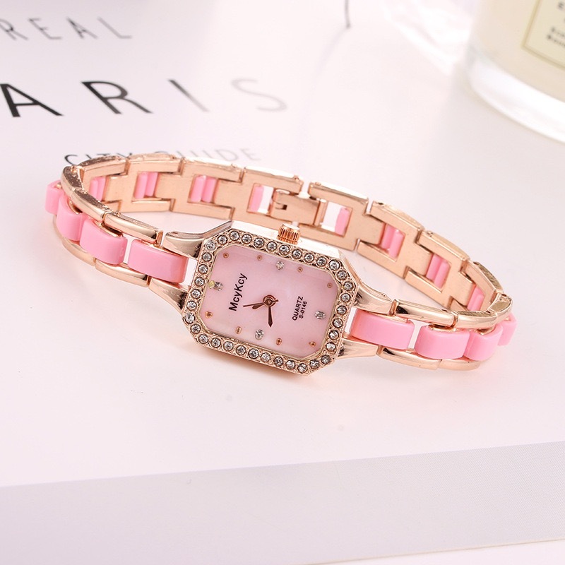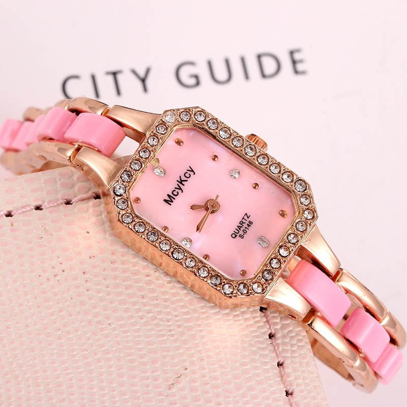 热销简约镶钻方形贝壳面女士休闲时尚卡胶不锈钢学生表带腕表