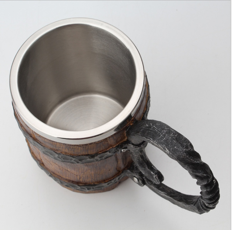 大容量仿真木头杯 不锈钢内胆马克杯 大手柄原木造型水杯
