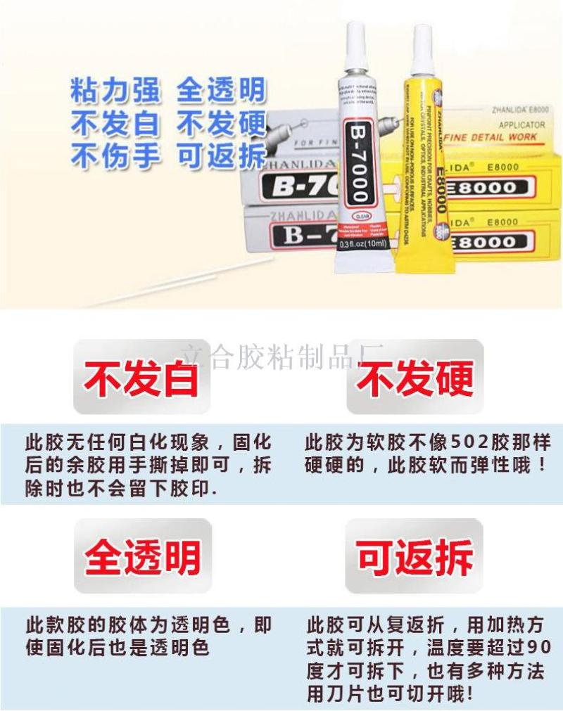 说明:手工DIY透明软性胶水,对产品没有腐蚀性,有一定的稠度,不会稀的像水一样,搞得整个产品都是胶水,在胶水没有完全固化前,可以很方便的擦除,不会留痕迹,不会像502胶水一样,流到外面一点就会有严重的白化现象擦都擦不掉,3-5分钟左右胶水固定,在此期间可以有足够的时间调整位置,24至48小时胶水达到最高强度。