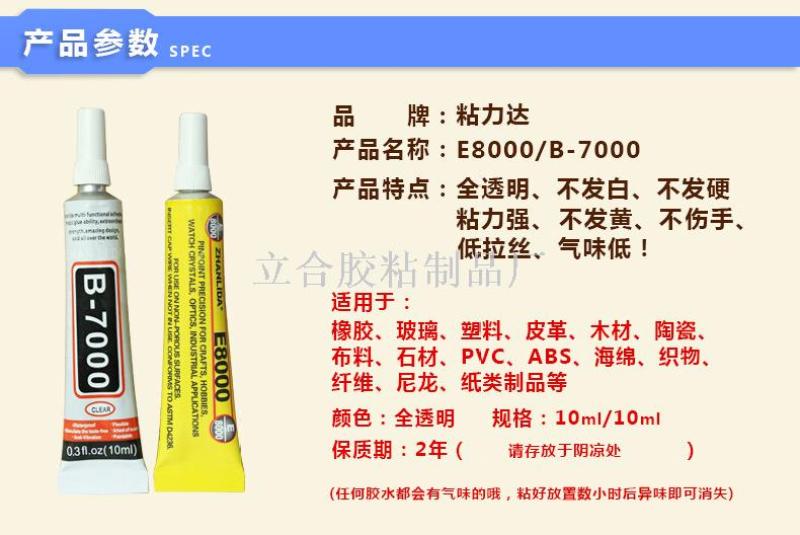 E8000胶粘剂可粘贴更多的材料,它对金属、玻璃、陶瓷、石材、竹木材、布料、皮革、PVC、ABS、尼龙、海绵、薄膜、织物、电子元件、塑料类、橡胶类、纤维类、纸张类,贴手机边框,液晶屏幕,中框,和其它材质都有很好的粘贴性能。