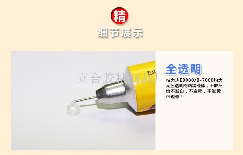 E8000自带针头胶粘剂是一种可满足玩具,水钻,各种装饰,花类,布类,壳类,饰品,工艺品等行业粘接的特殊环保胶剂,与其它胶粘剂相比,E8000刺激性的气味微小而且还有澹澹清馨香味;属于单组份新型透明溶液胶,室温固化,操作方便不需重新分装,开盖既可使用具有高弹性,胶膜柔软,防振动和防水。