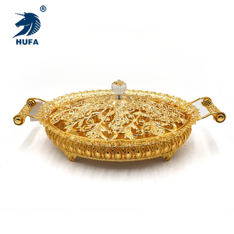 大尺寸金属椭圆形黄金巧克力果盘 带把手和盖子..