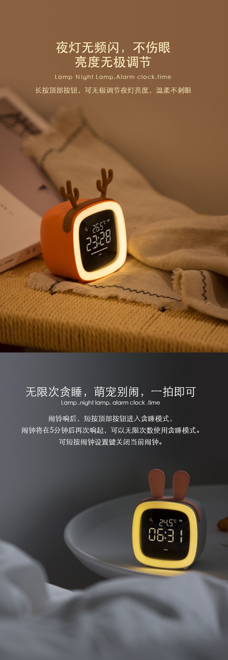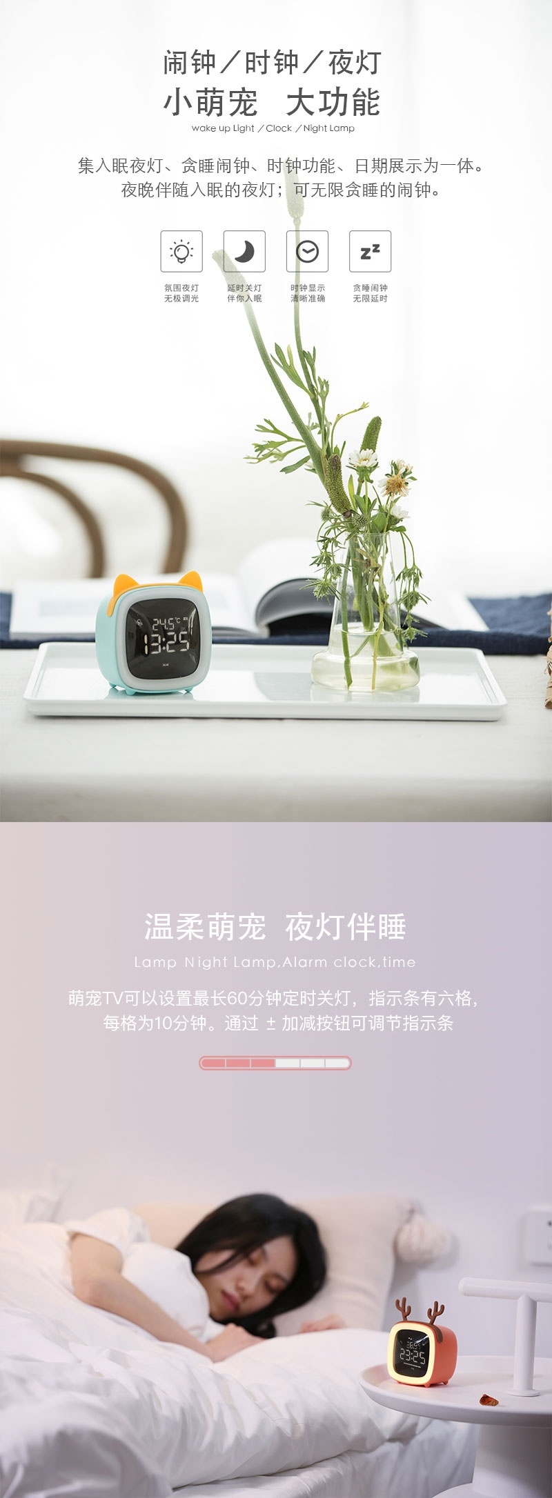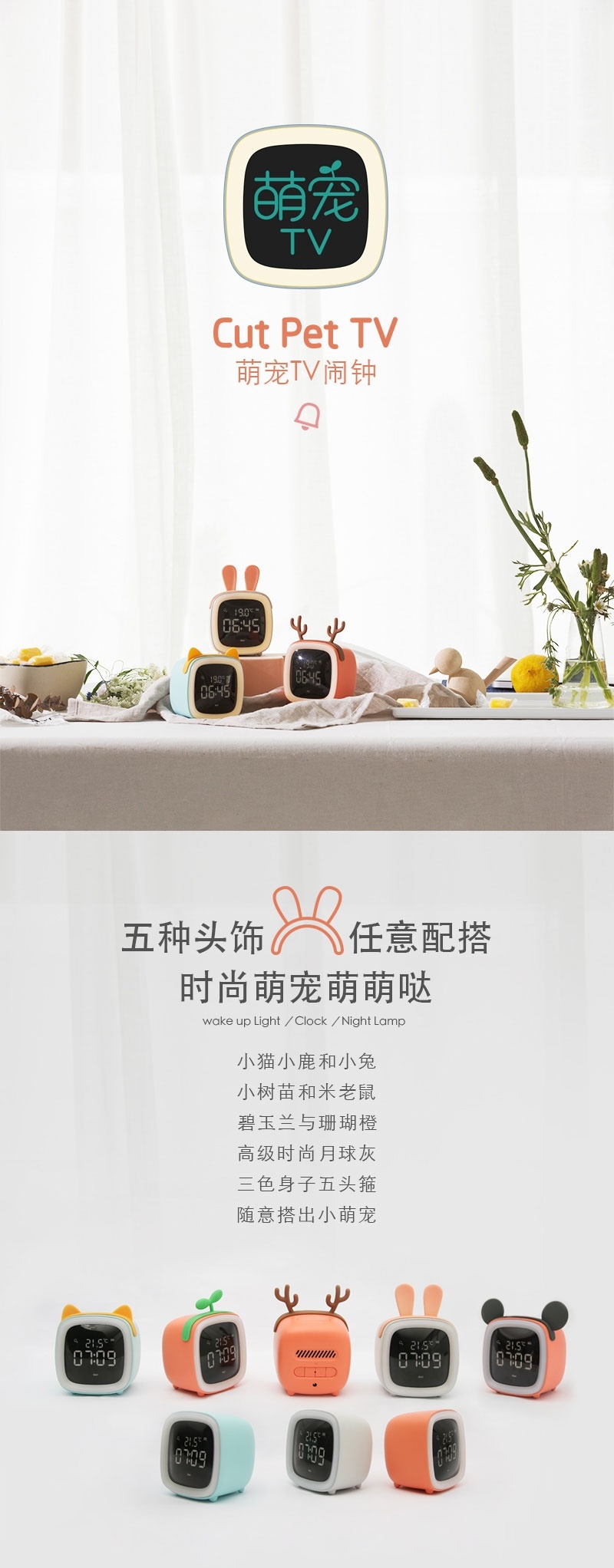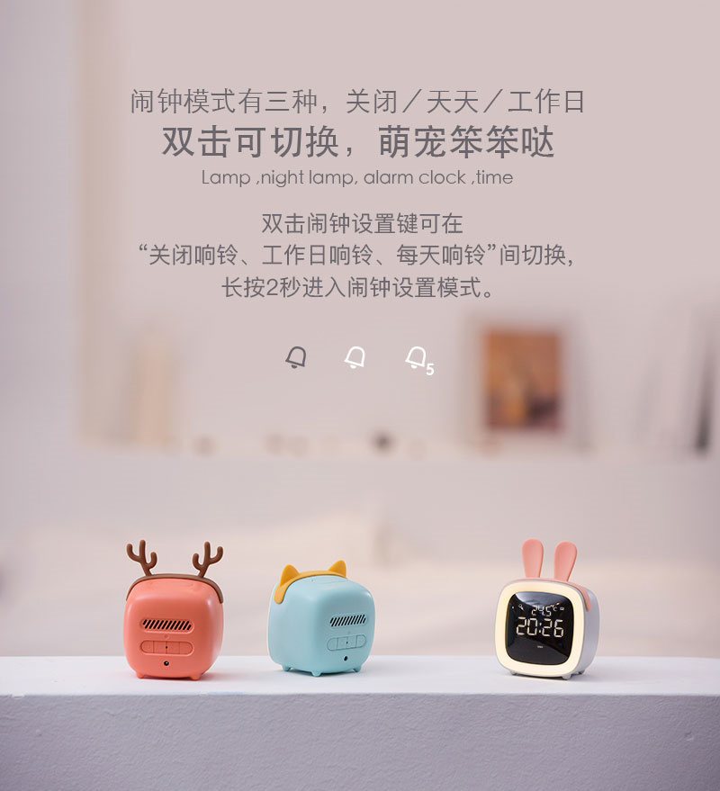萌宠TV闹钟学生用闹铃多功能卧室可爱卡通创意声控Led时钟床头灯