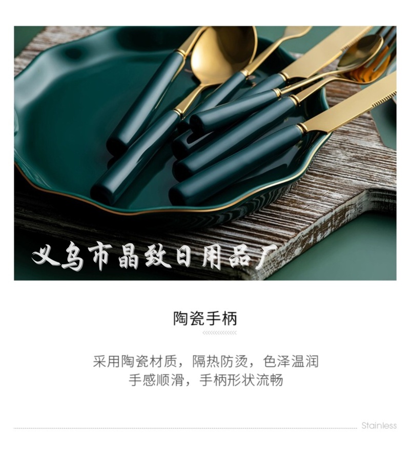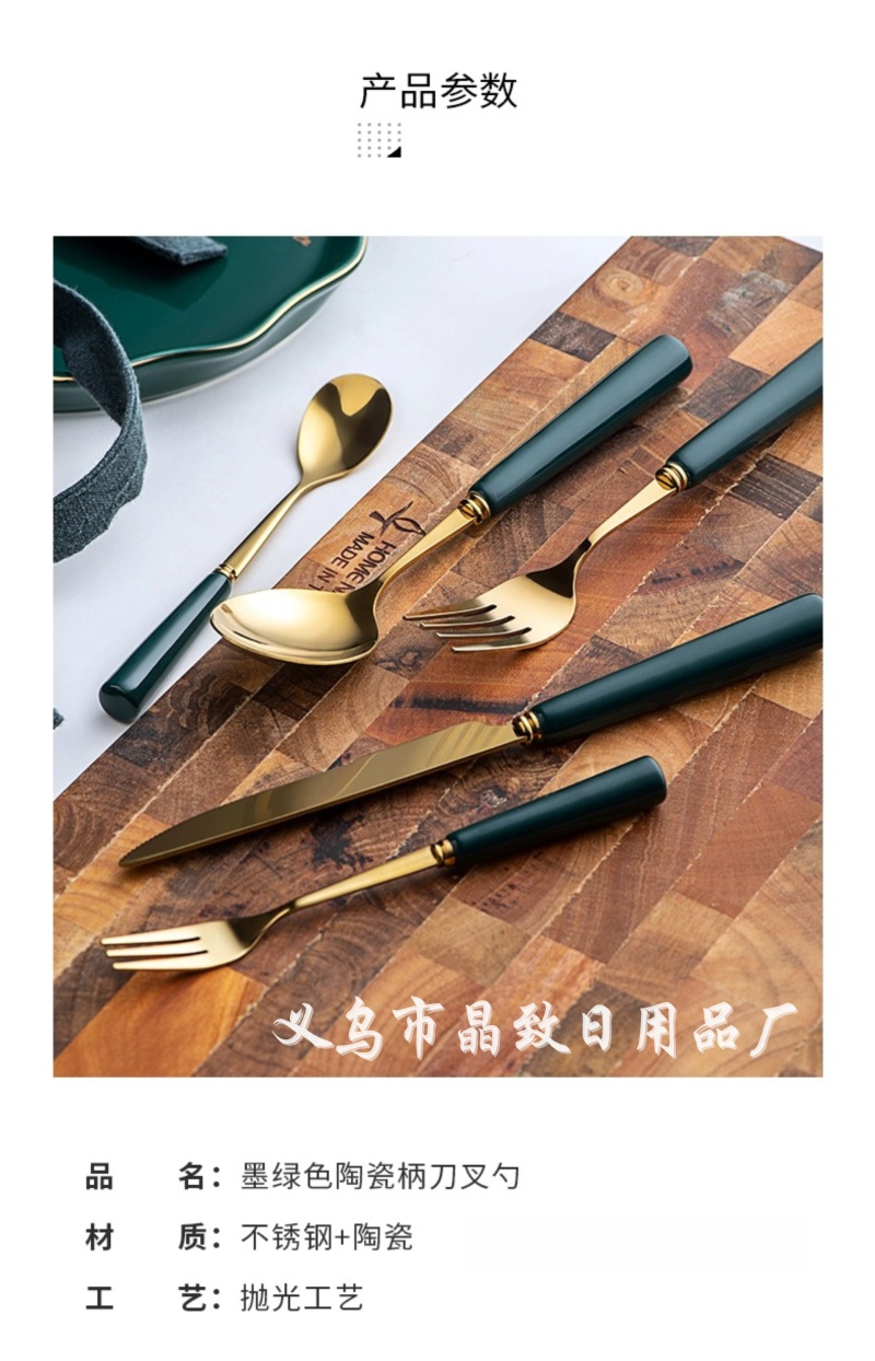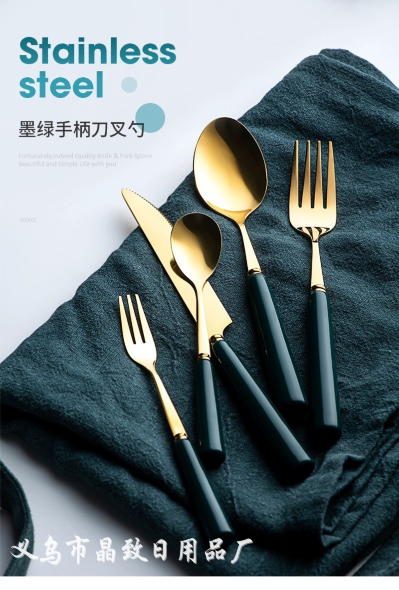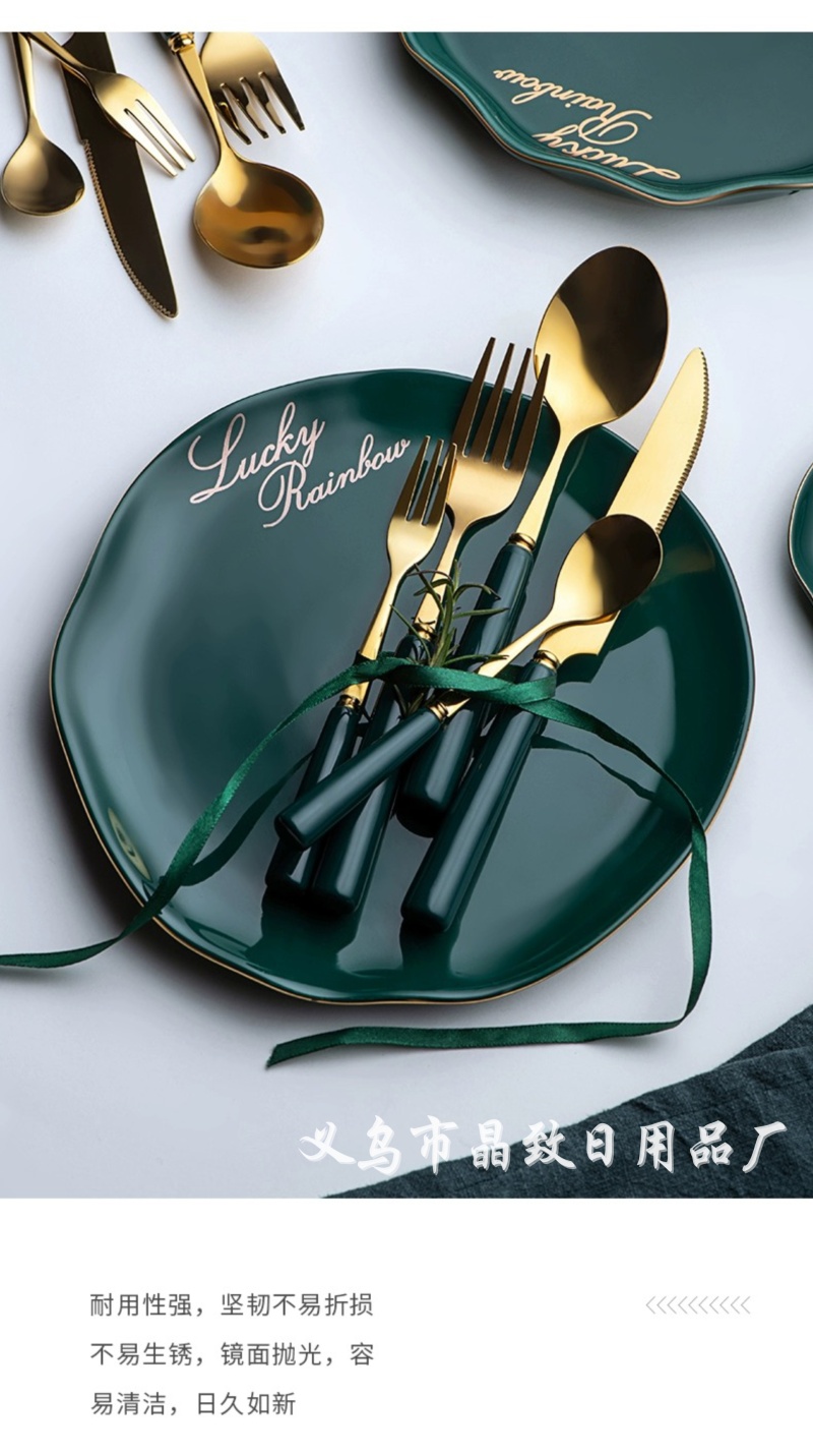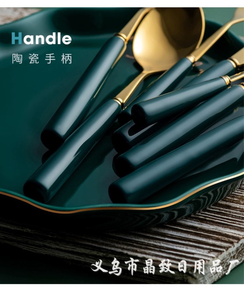 晶致优质新款墨绿色陶瓷柄餐具镀金不锈钢刀叉勺西餐具家用餐具
