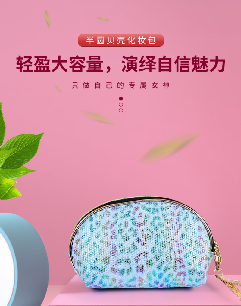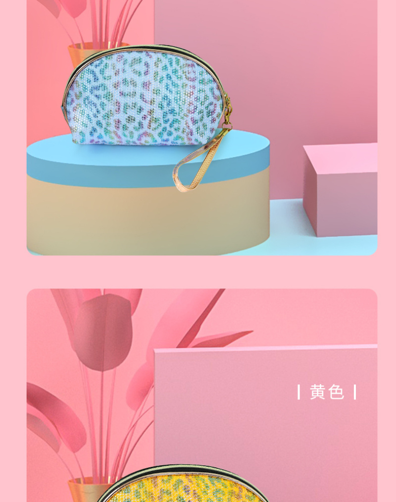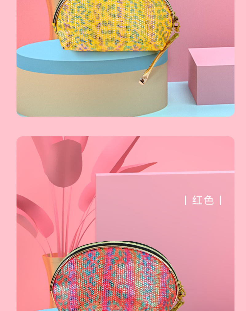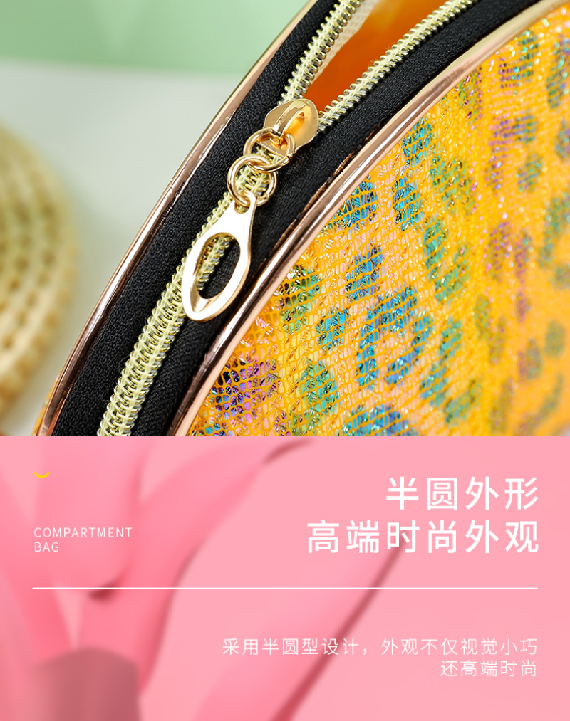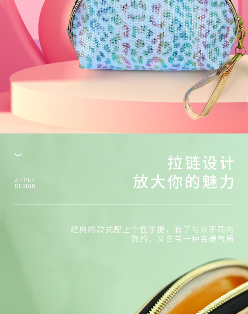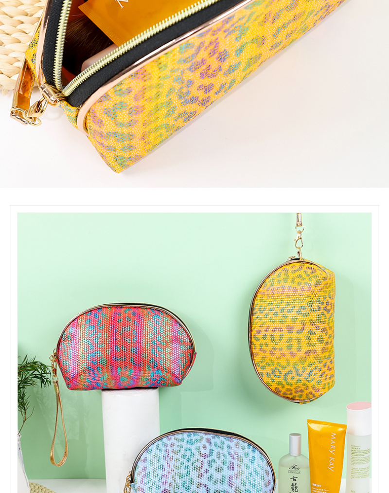 新款女士化妆包PU半圆镭射小豹纹包防水耐磨便捷手拿包化妆品贝壳