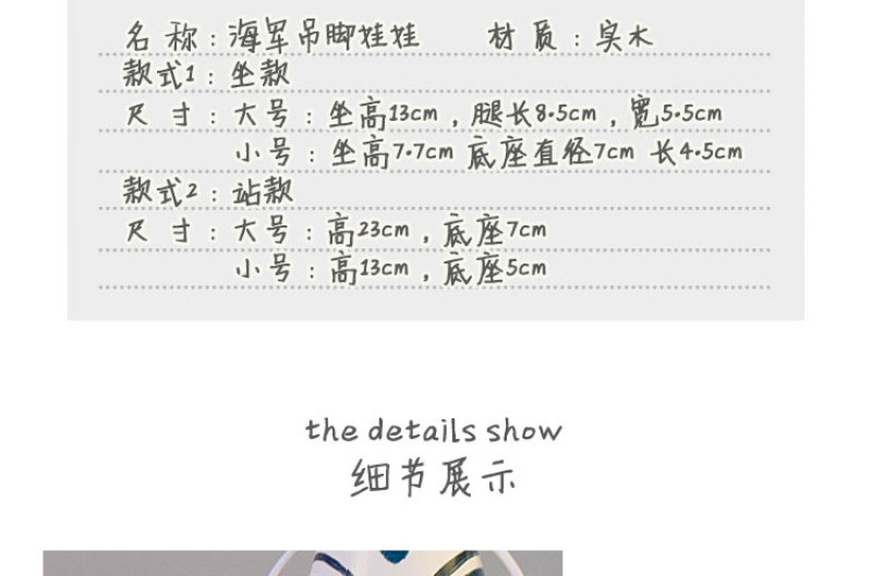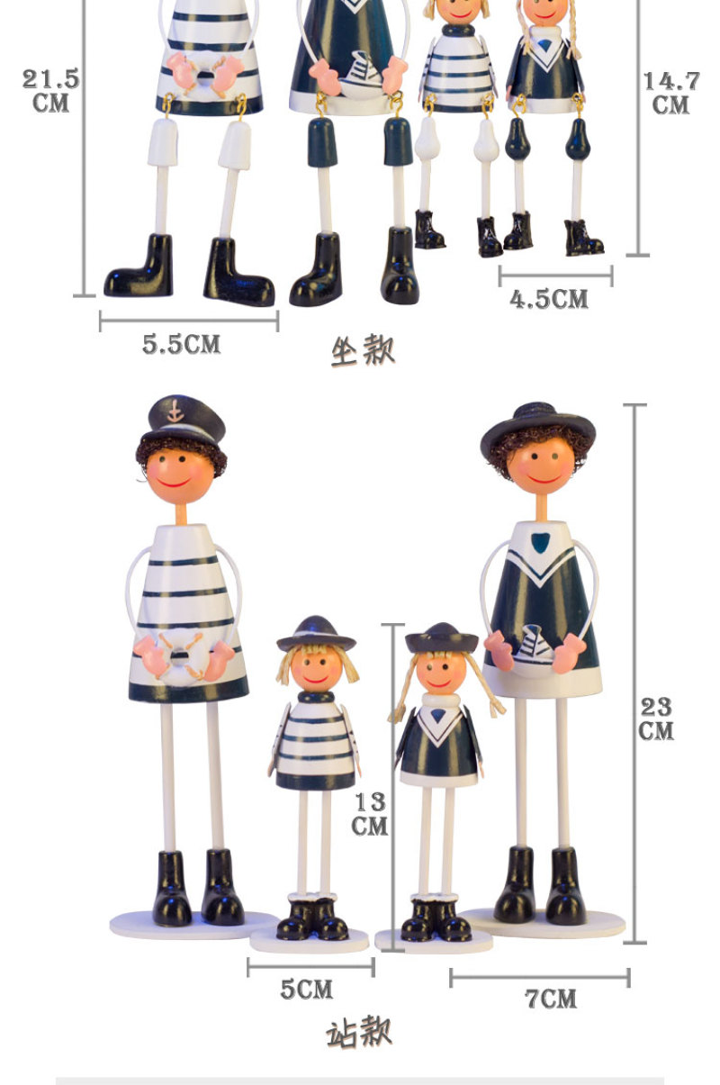 站款大号:高23CM,底座7CM 站款小号:高13CM,底座5CM 坐款大号:坐高13CM,腿长8.5CM,宽5.5CM 坐款小号:坐高7.7CM,腿长7CM,宽4.5CM |