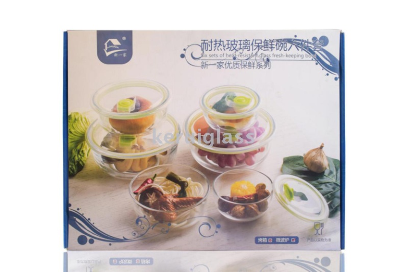 低硼玻璃耐热保鲜碗六件套 6套/箱 体积0.124 重量21.4KGS