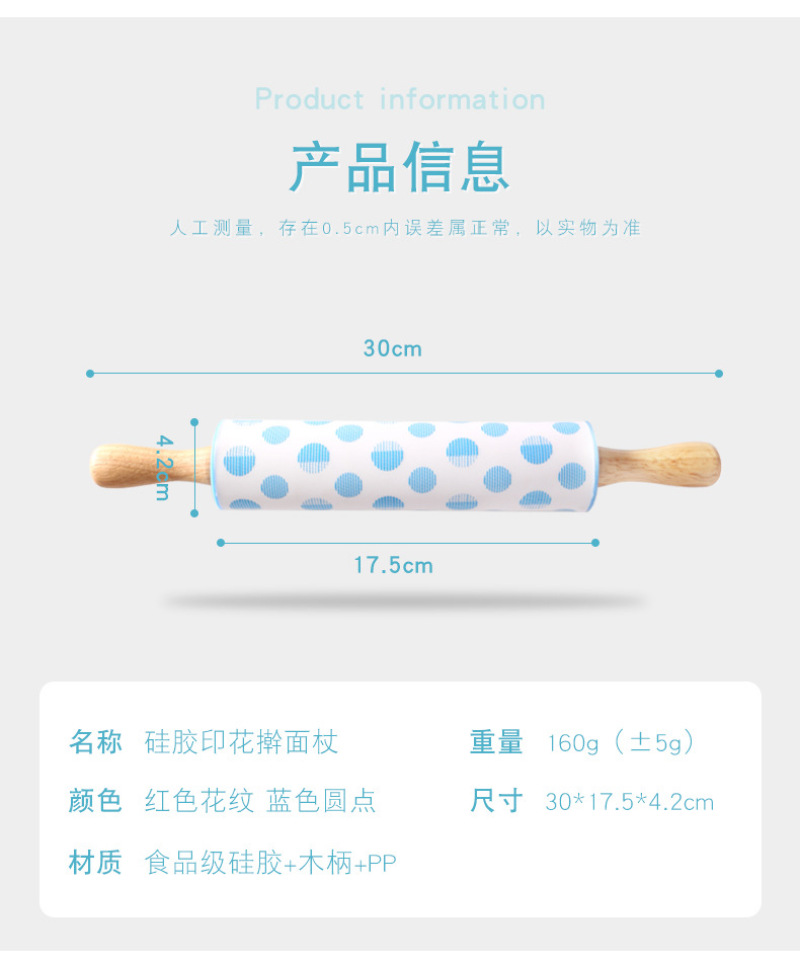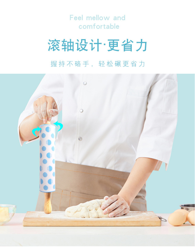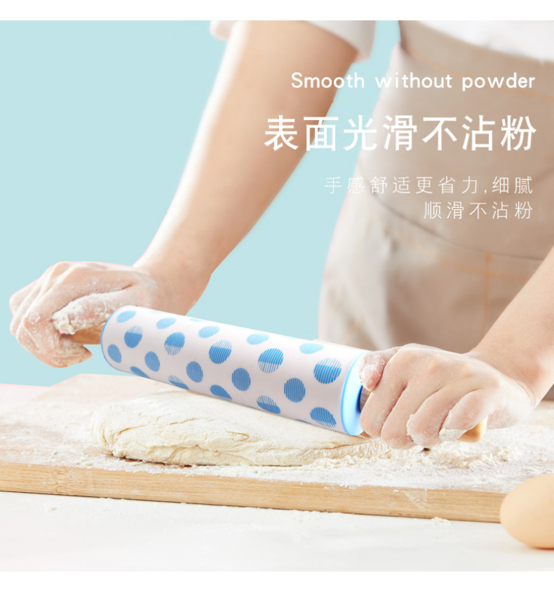 食品级实木柄硅胶擀面杖 滚轴式不粘厨房家用印花饺子皮面粉棍