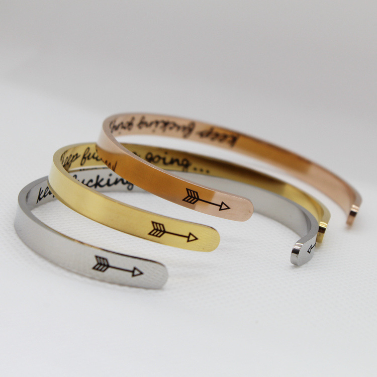 跨境电商爆款不锈钢手镯钛钢C形6MM keep fucking going...定制做