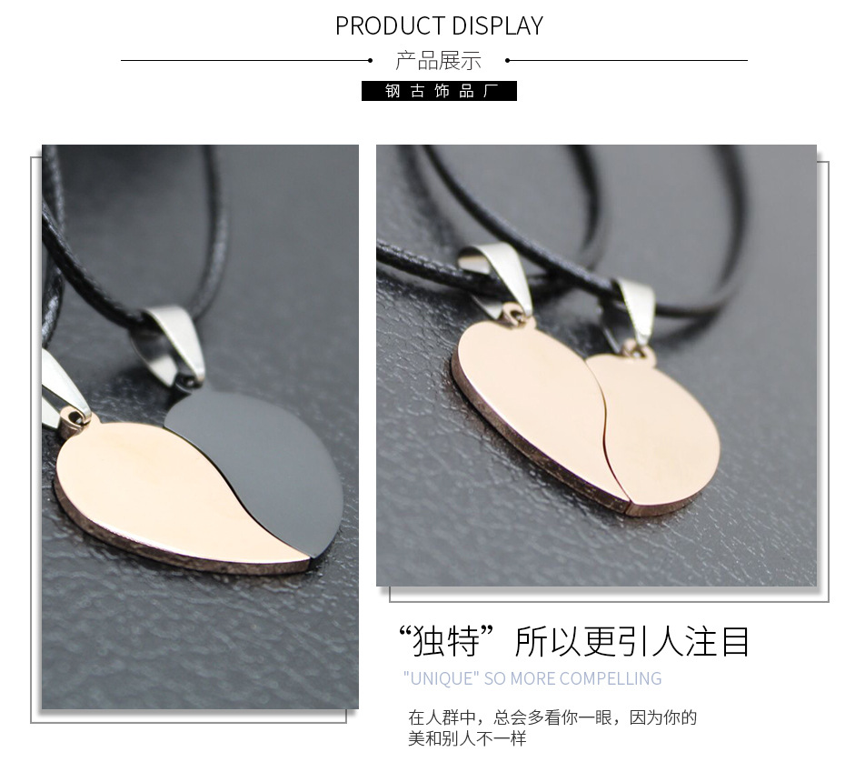 钛钢心形情侣吊坠一对 不锈钢半心拼接吊牌批发 定做logo广告礼品