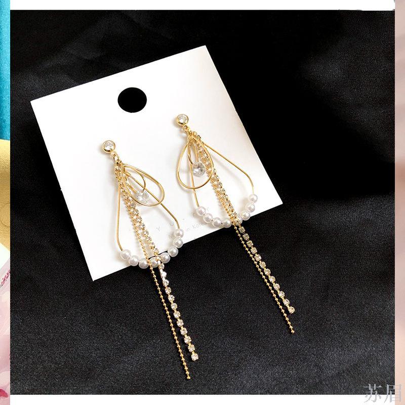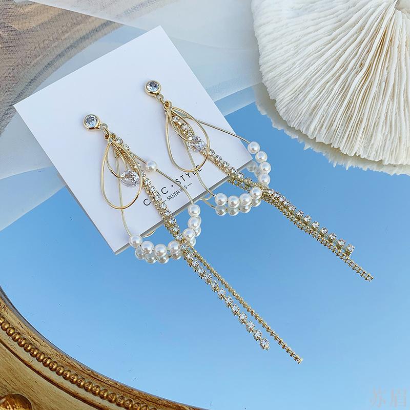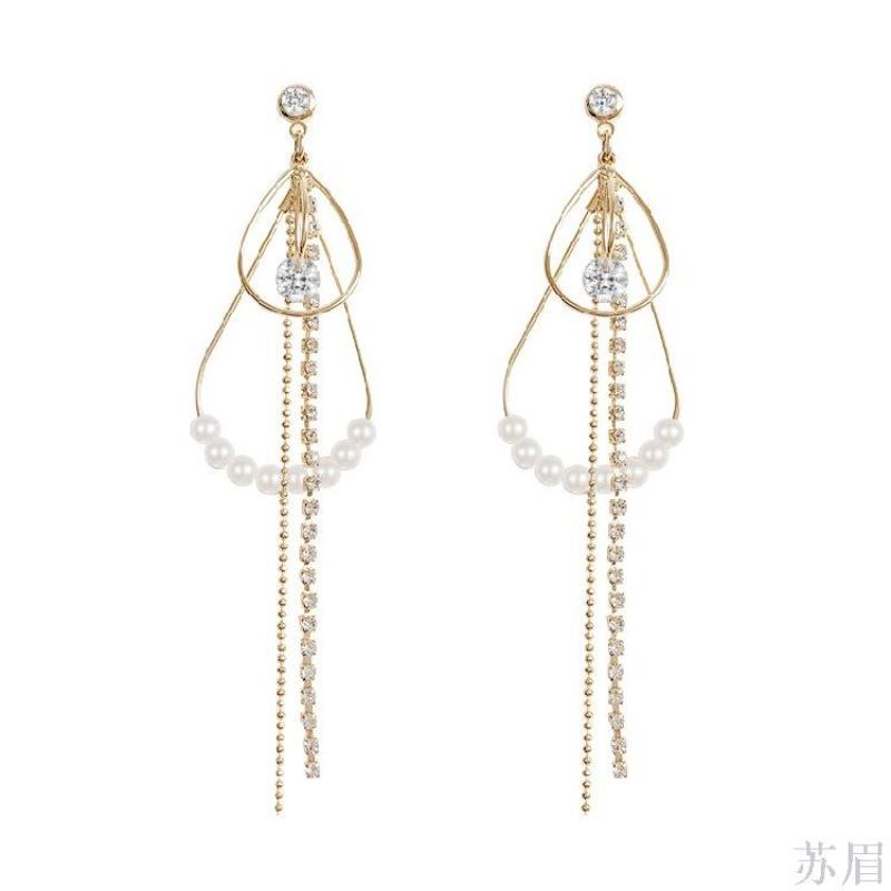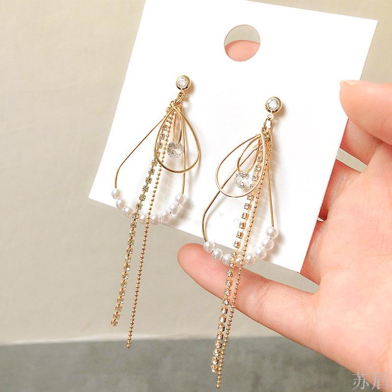 925银韩式珍珠串金属镶钻链条锆石珍珠流苏显脸瘦耳环长款耳坠女