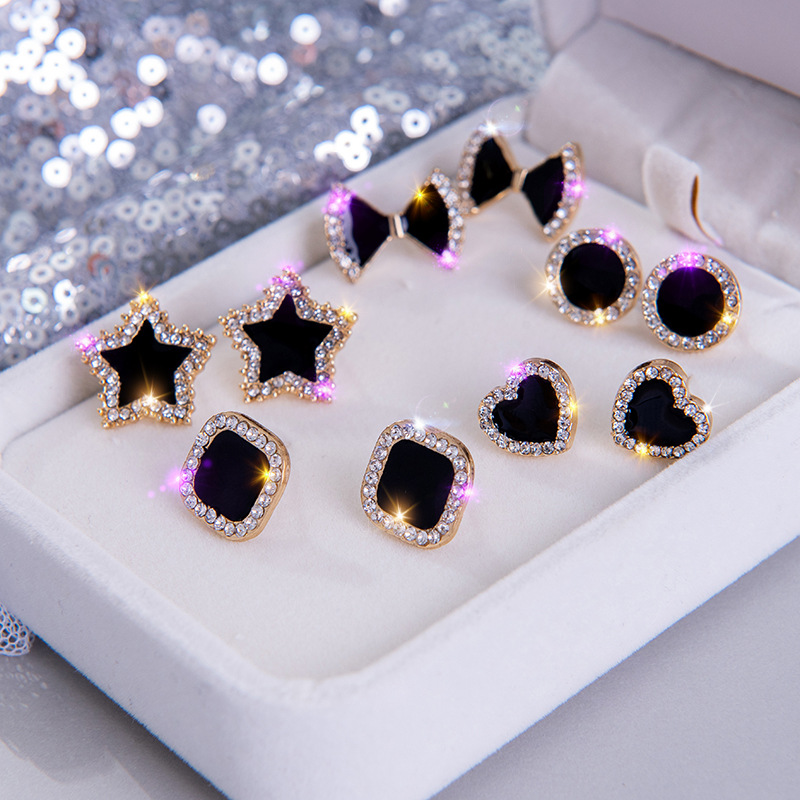 s925纯银针五角星耳钉女黑色气质蝴蝶结桃心耳饰韩国简约新款耳环